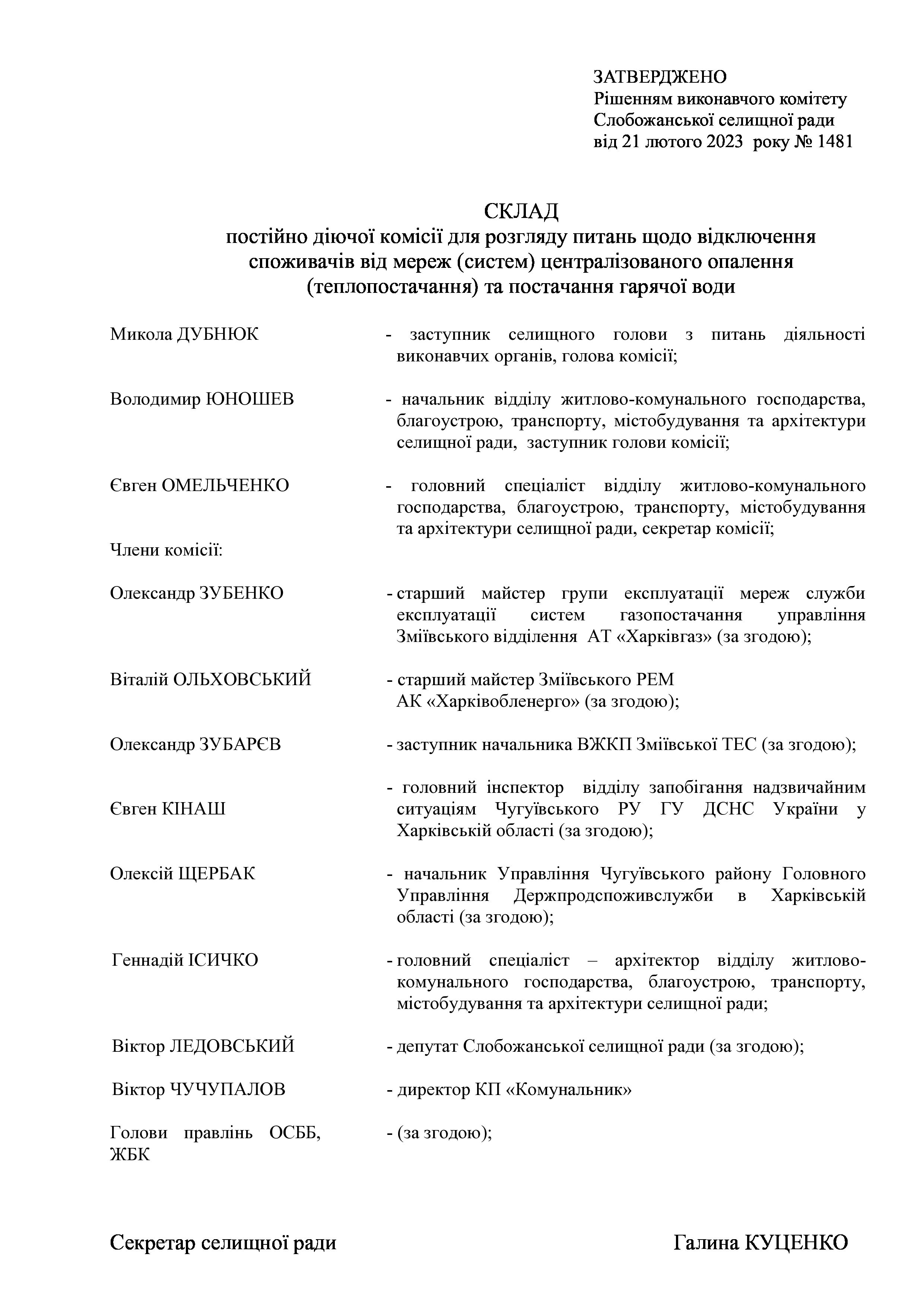 Рішення сесії №1481-VIII Про створення постійно діючої комісії для розгляду питань щодо відключення споживачів від мереж (систем) централізованого опалення (теплопостачання) та постачання гарячої води.