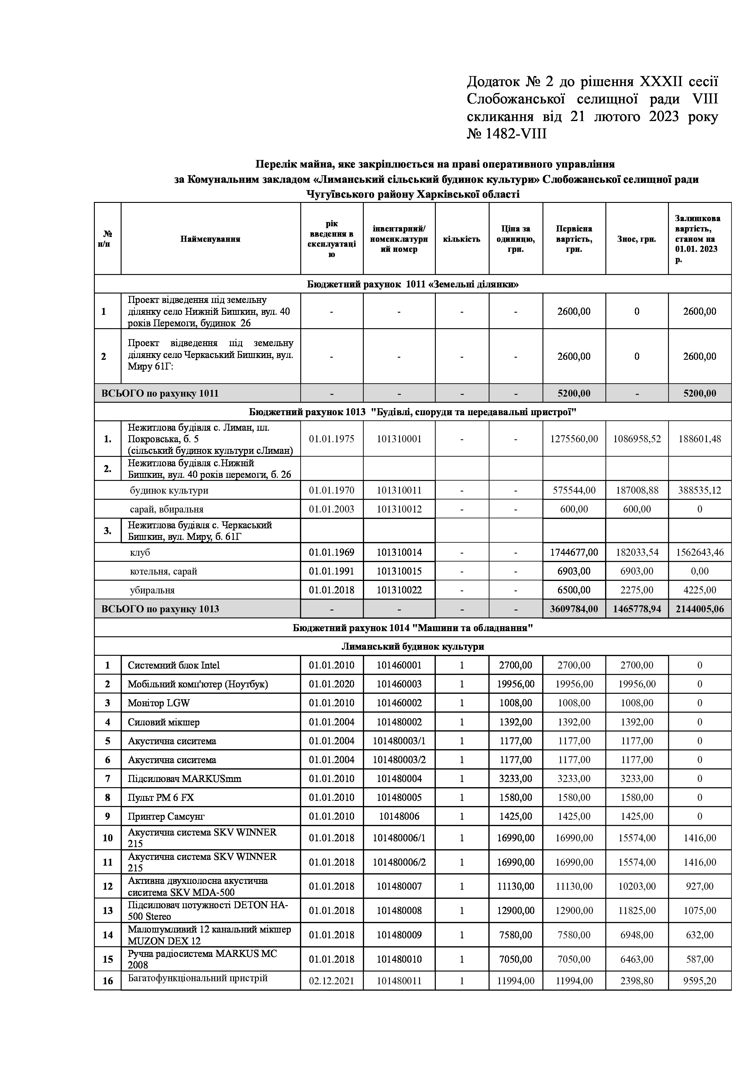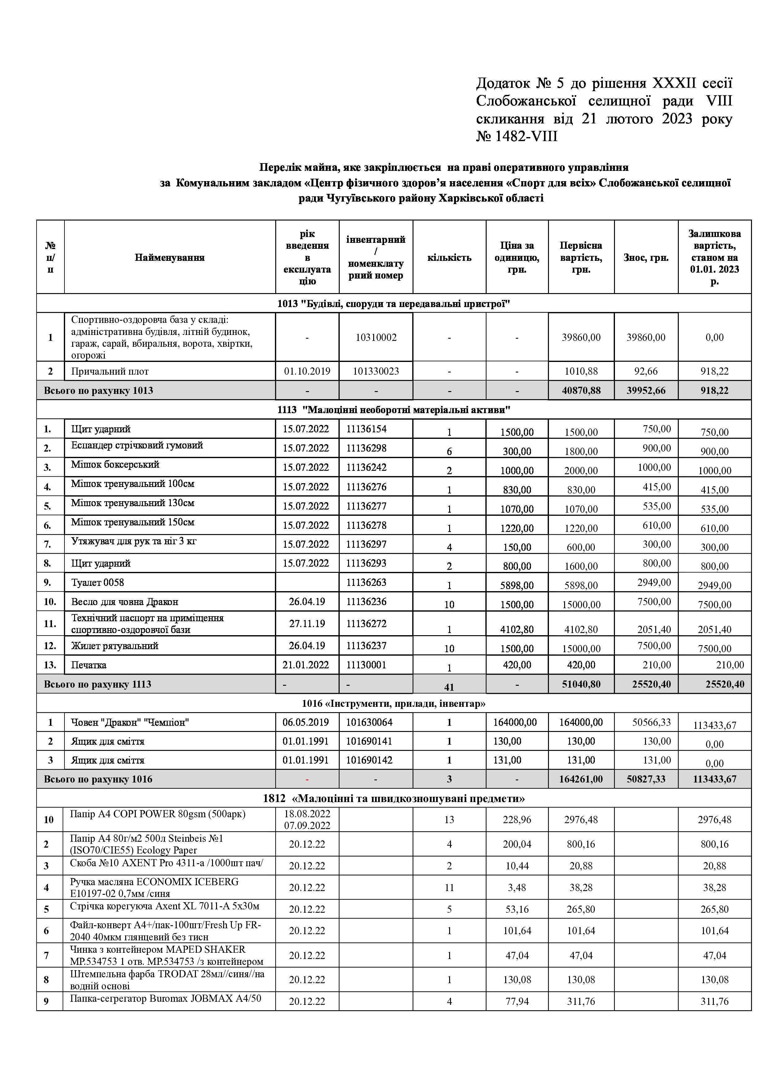 Рішення сесії №1482-VIII Про закріплення на праві оперативного управління майна Слобожанської селищної територіальної громади за закладами культури та спорту.