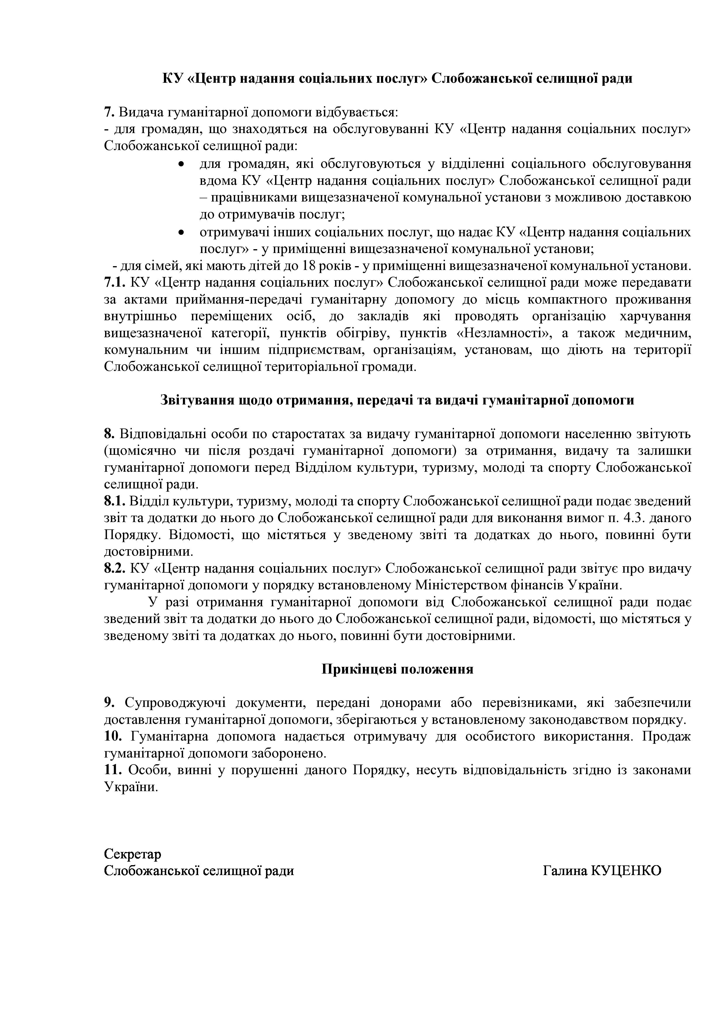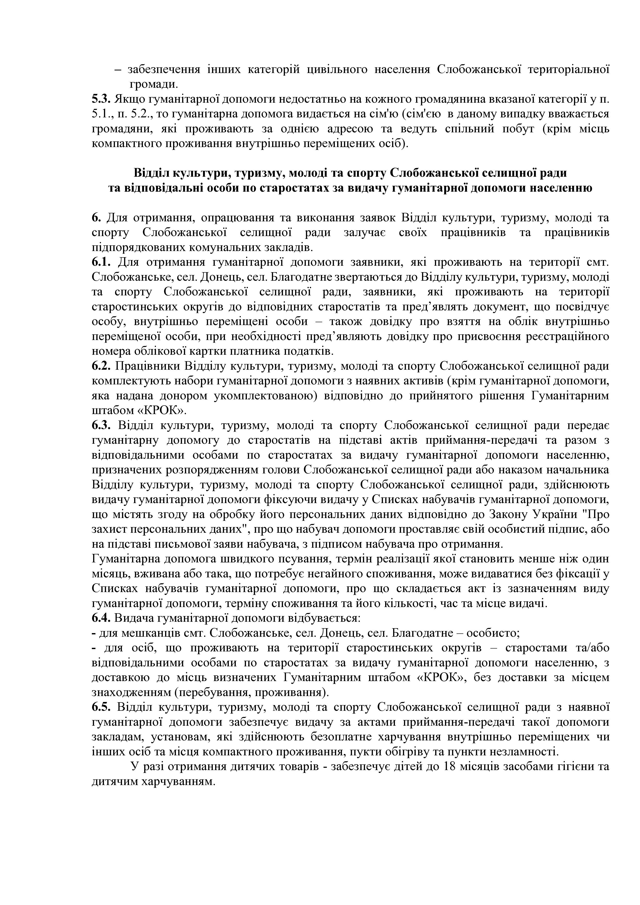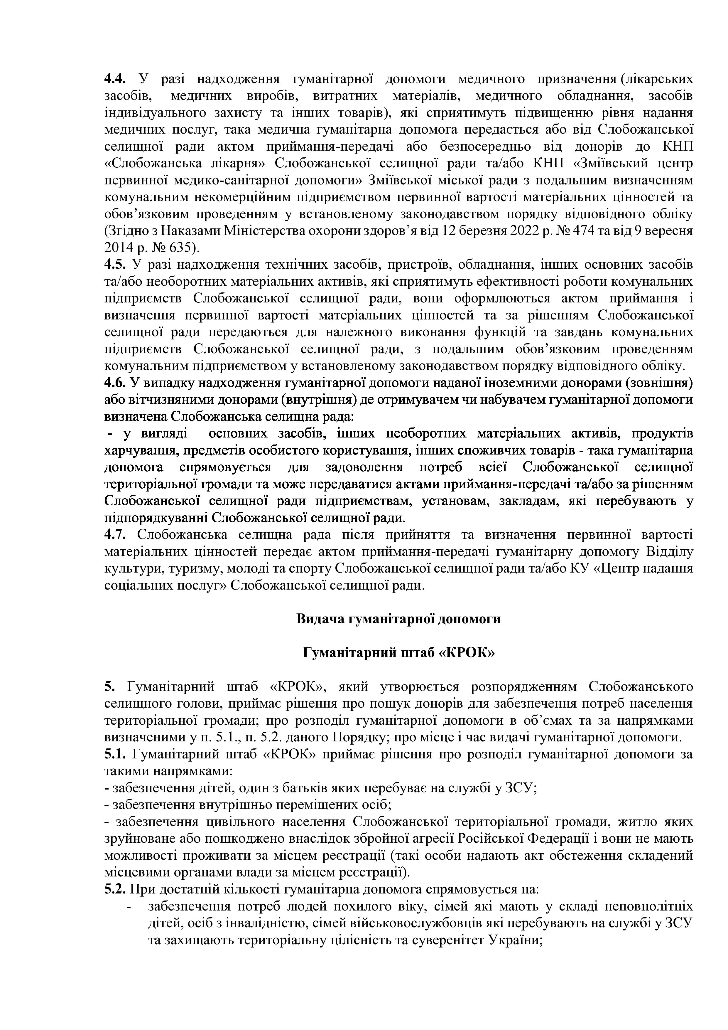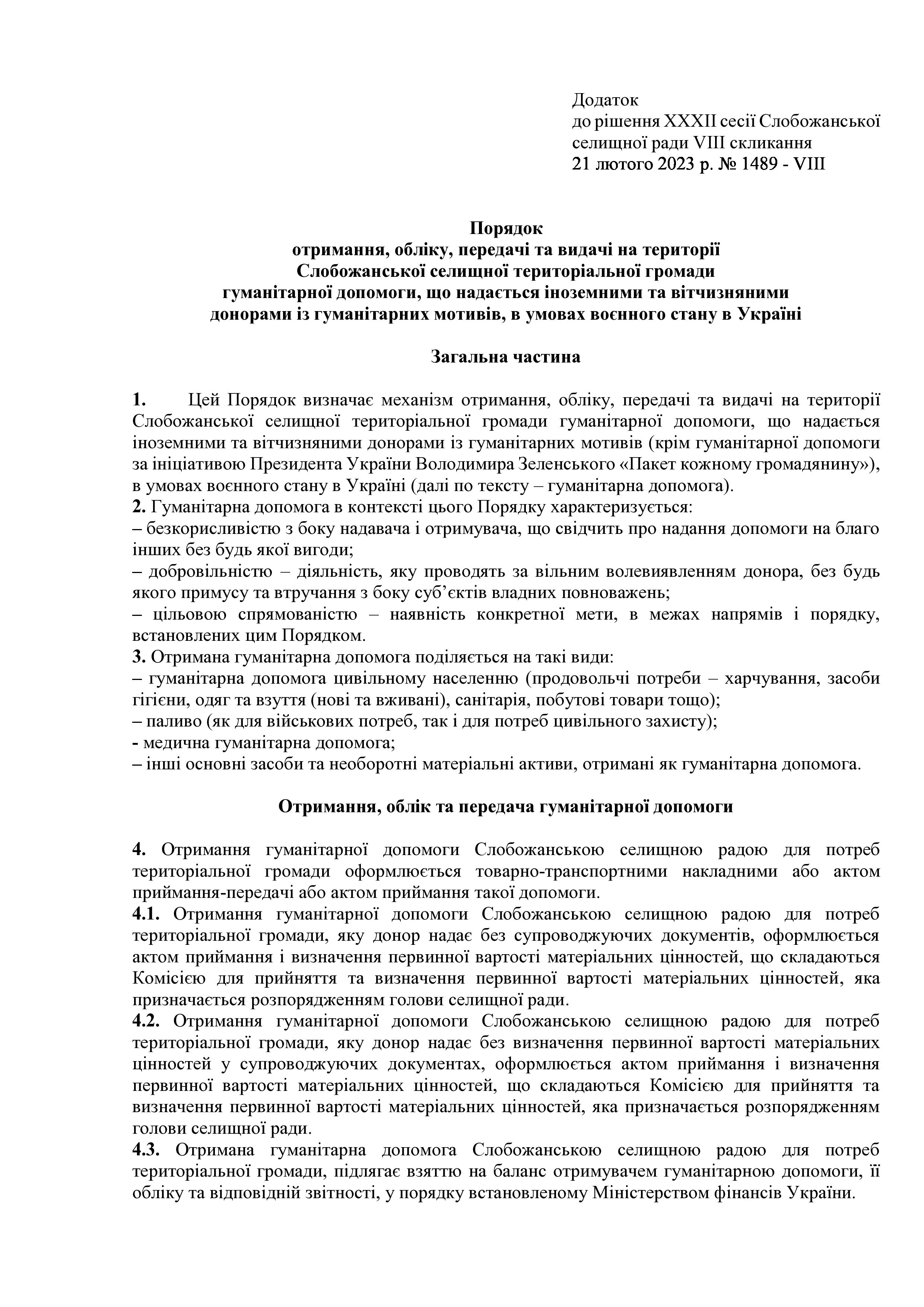 Рішення сесії №1489-VIII Про затвердження Порядку отримання, обліку, передачі та видачі на території Слобожанської селищної територіальної громади гуманітарної допомоги, що надається іноземними та вітчизняними донорами із гуманітарних мотивів, в умовах воєнного стану в Україні.