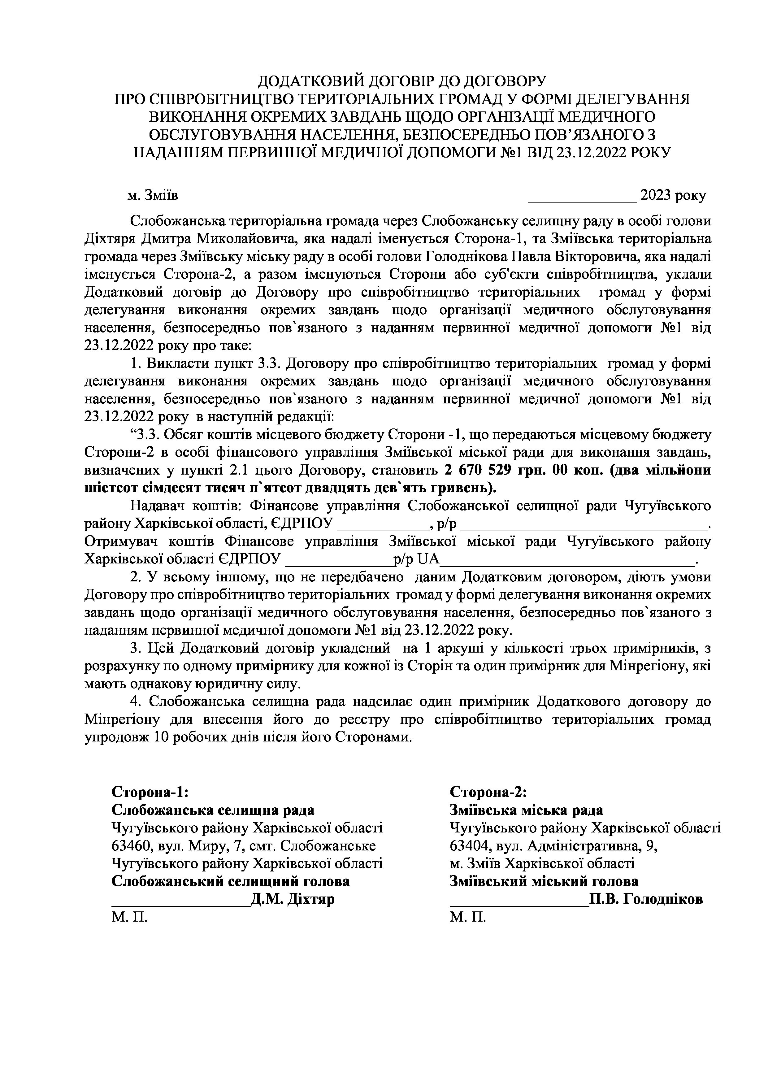 Рішення сесії №1490-VIII Про схвалення проєкту Додаткового договору до договору про співробітництво територіальних громад у формі делегування виконання окремих завдань щодо організації медичного обслуговування населення, безпосередньо пов’язаного з наданням первинної медичної допомоги №1 від 23.12.2022 року.