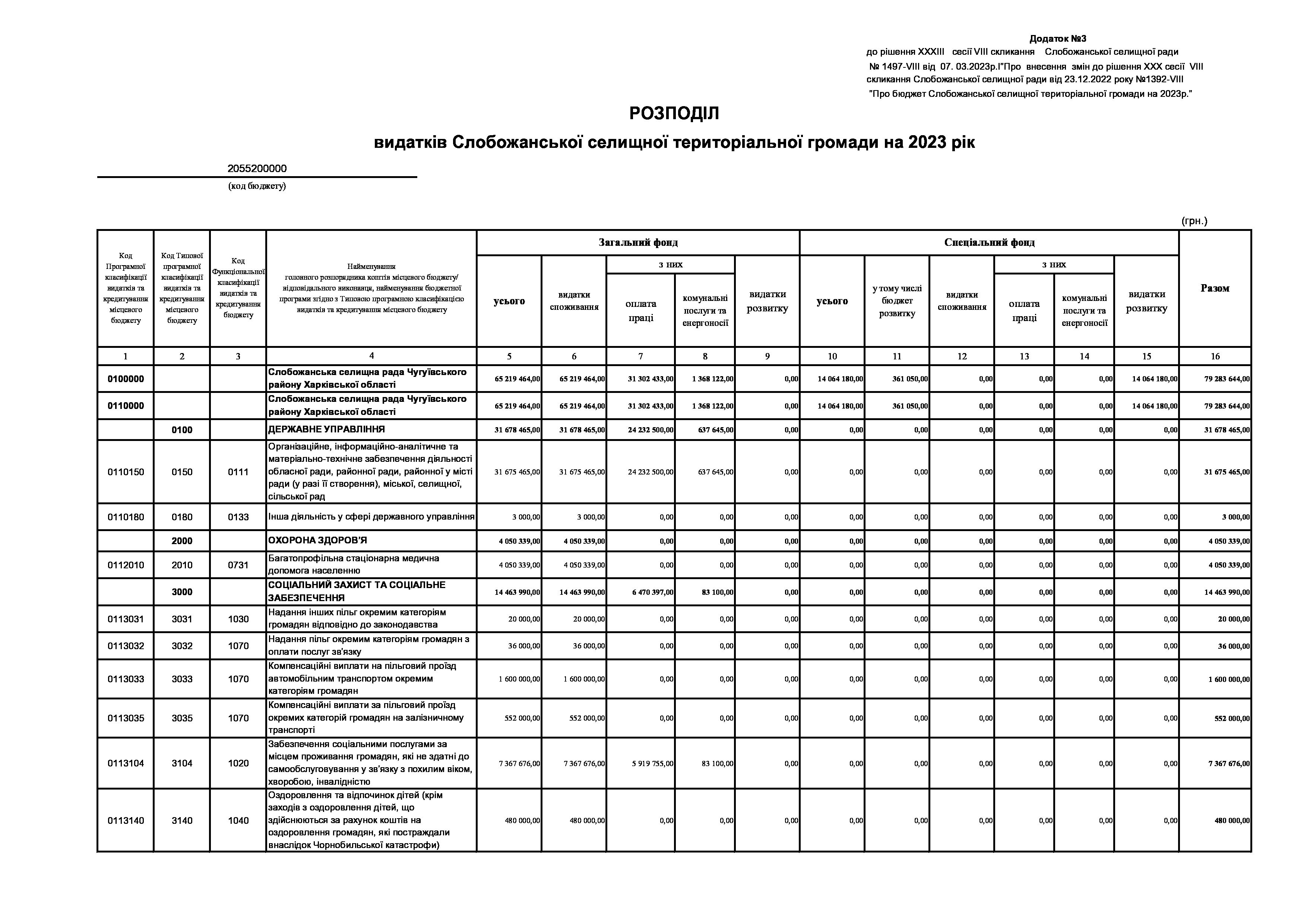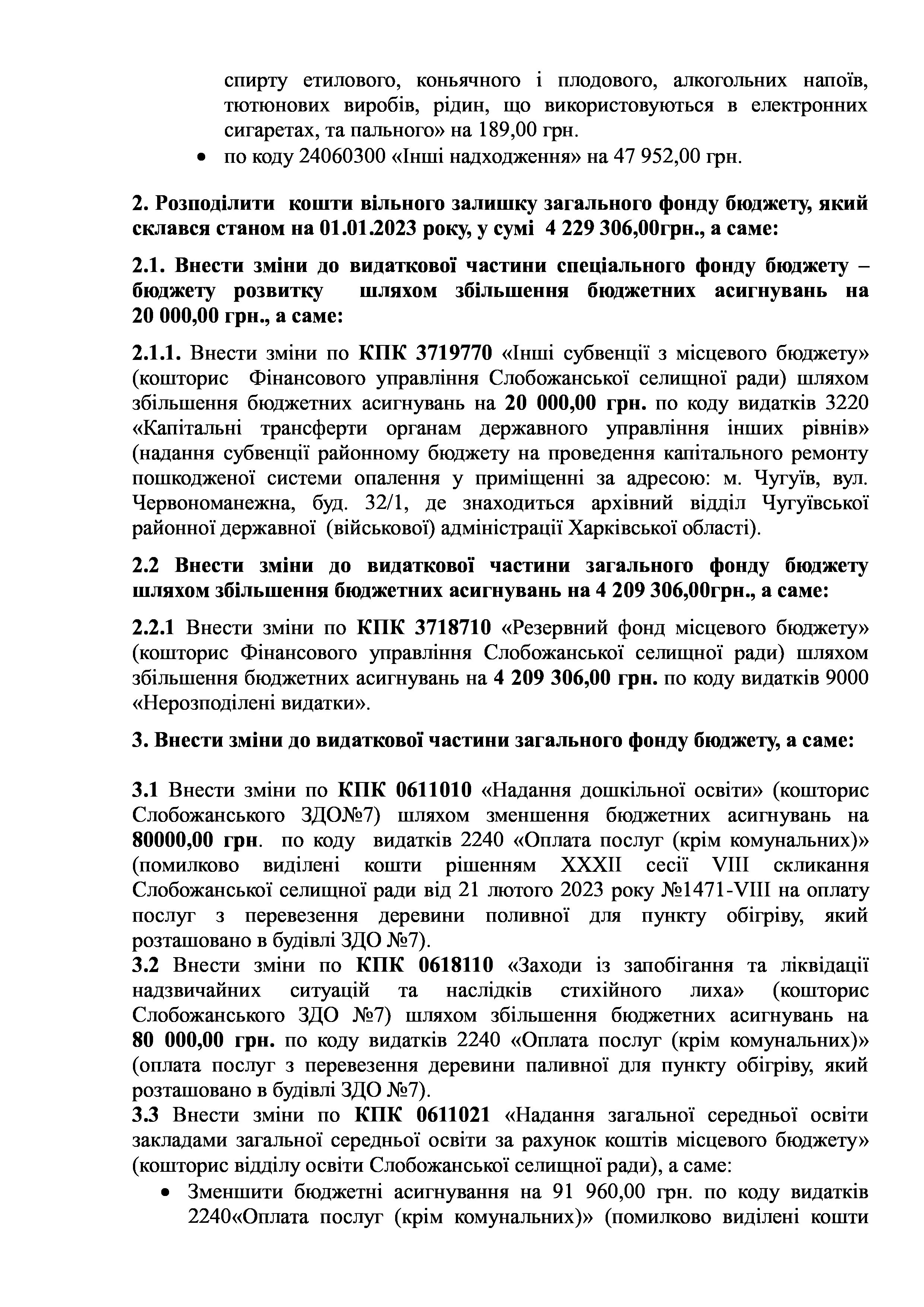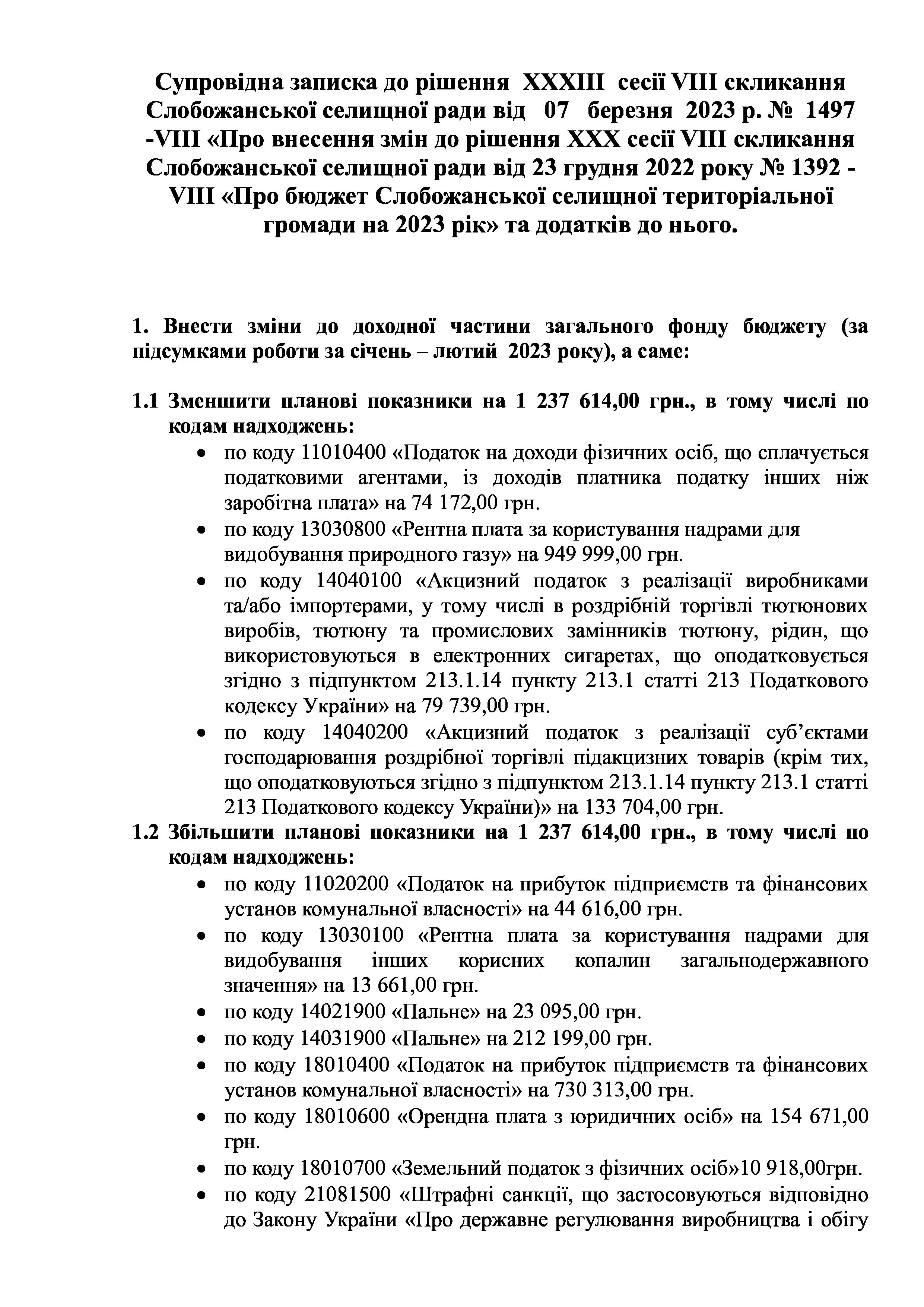 Рішення сесії №1497-VIII Про внесення змін до рішення ХХХ сесії VIІI скликання Слобожанської селищної ради від 23 грудня 2022 року №1392-VIІI «Про бюджет Слобожанської селищної територіальної громади на 2023 рік».