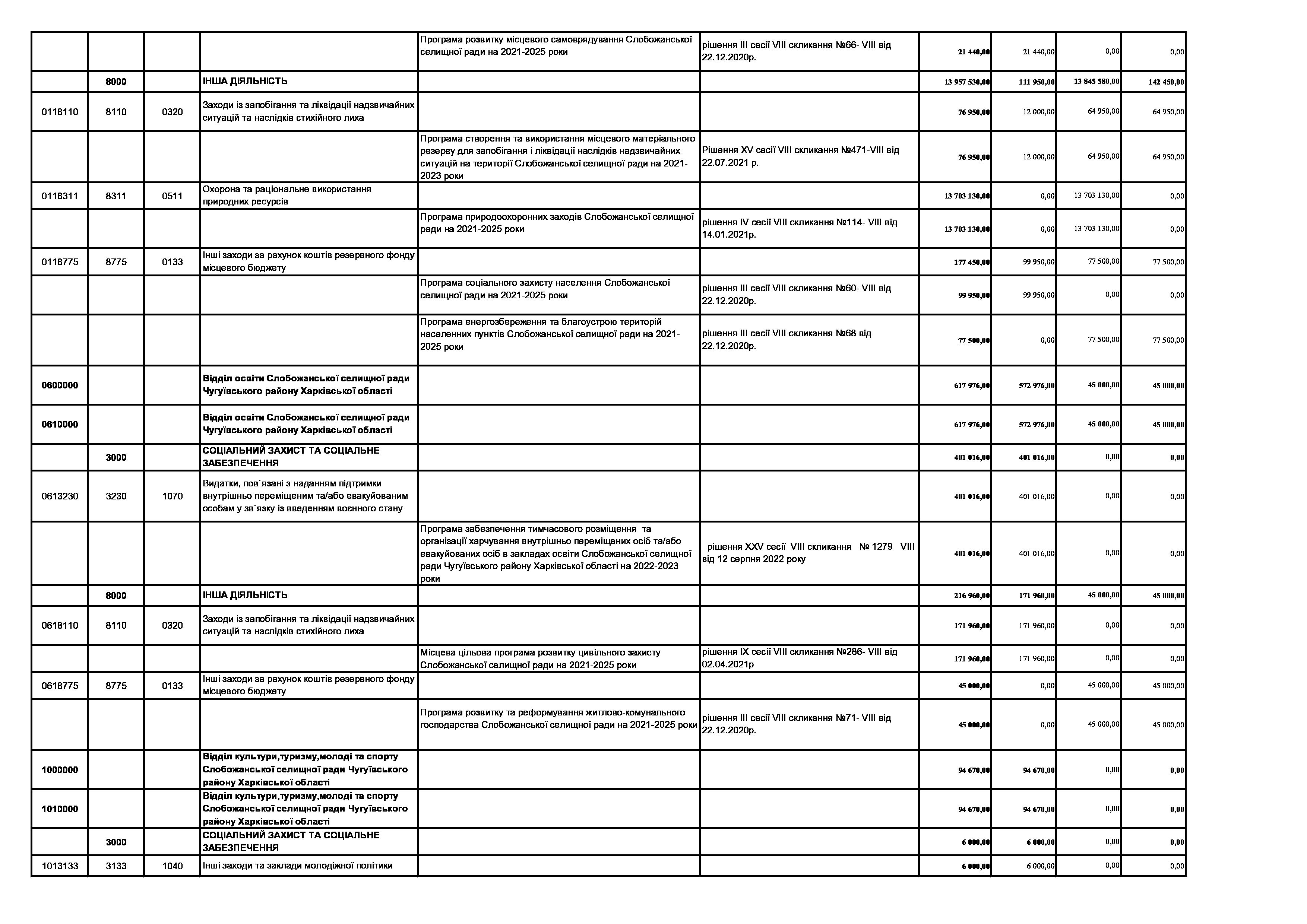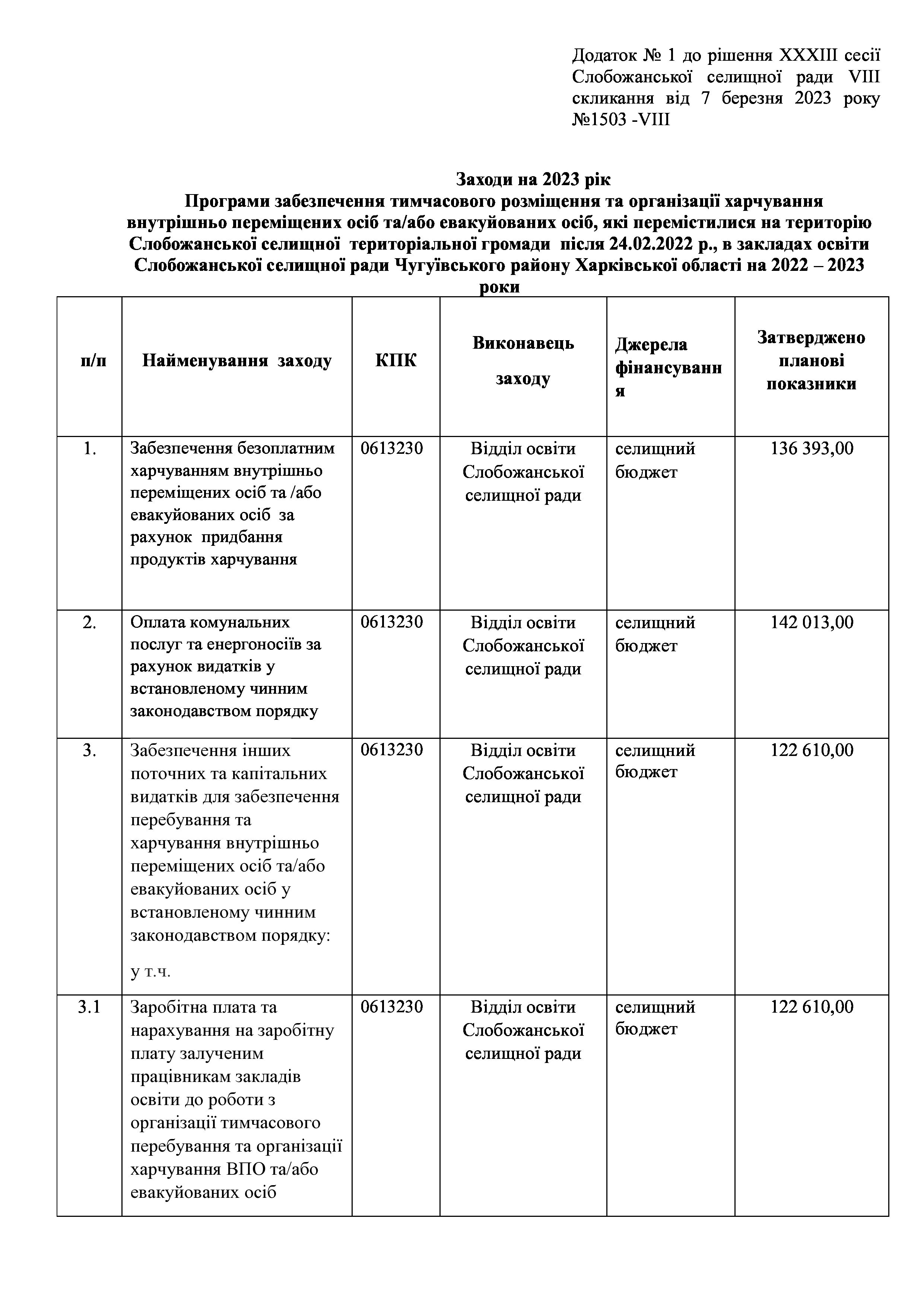 Рішення сесії №1503-VIII Про внесення змін до Заходів на 2023 рік до Програми забезпечення тимчасового розміщення та організації харчування внутрішньо переміщених осіб та/або евакуйованих осіб, які перемістилися на територію Слобожанської селищної територіальної громади після 24.02.2022 р., в закладах освіти Слобожанської селищної ради Чугуївського району Харківської області на 2022 – 2023 роки.