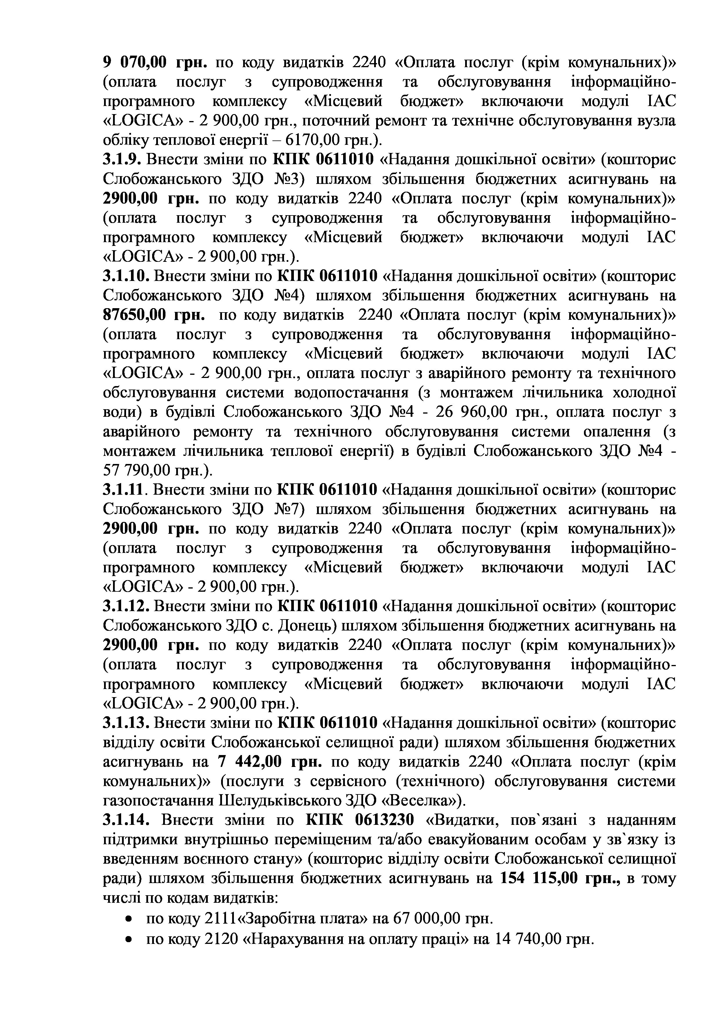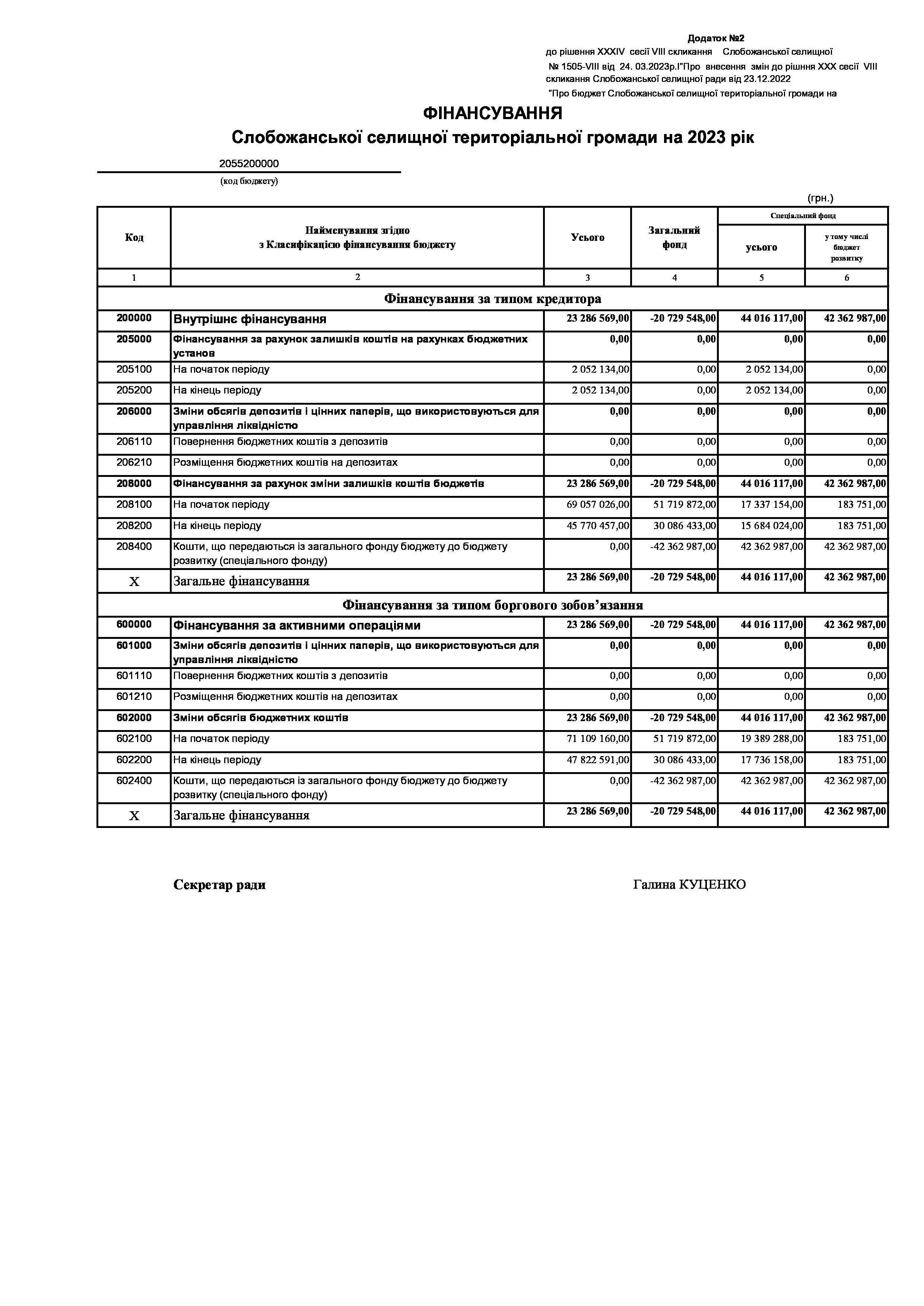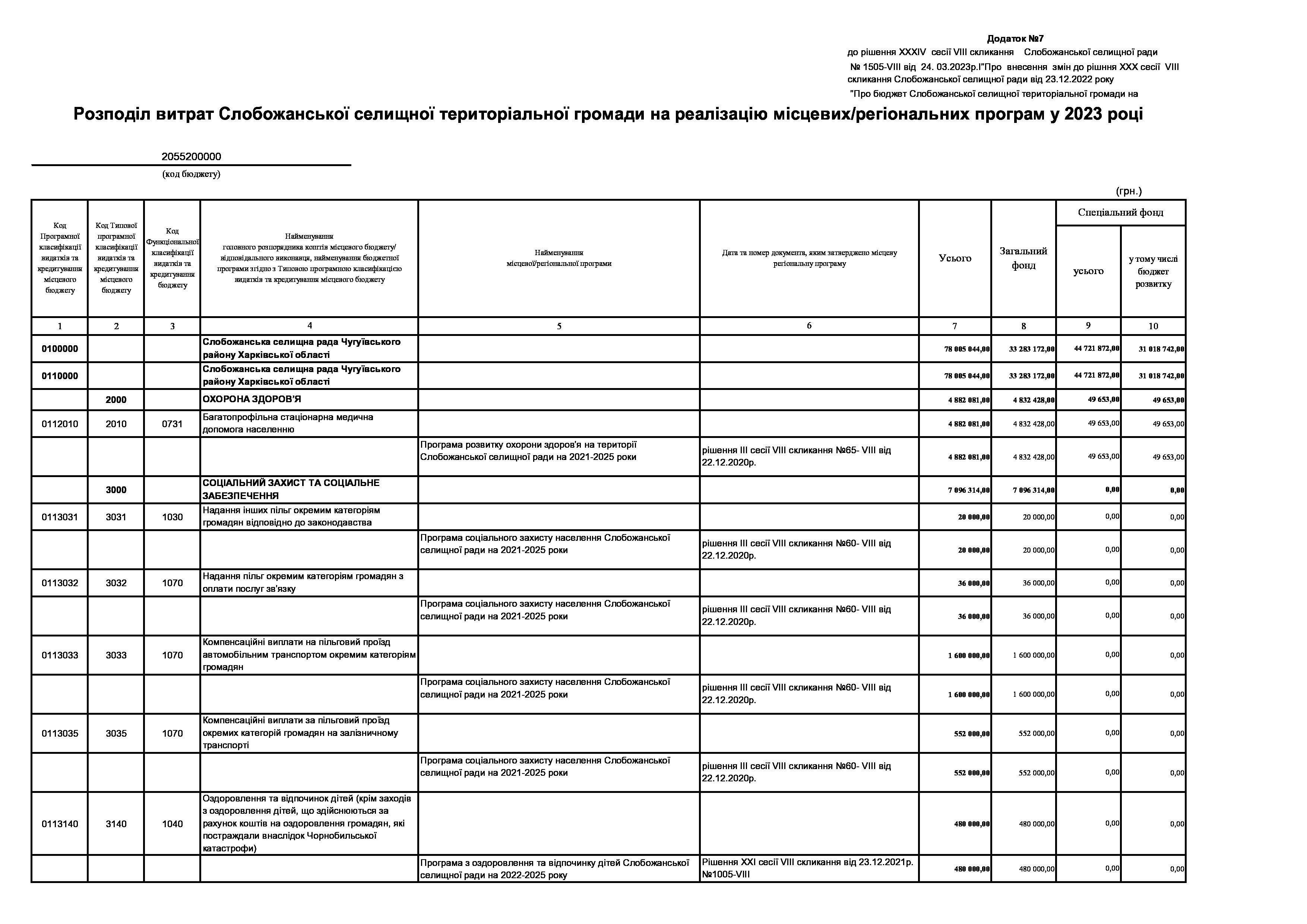 Рішення сесії №1505-VIII Про внесення змін до рішення ХХХ сесії VIІI скликання Слобожанської селищної ради від 23 грудня 2022 року №1392-VIІI «Про бюджет Слобожанської селищної територіальної громади на 2023 рік».