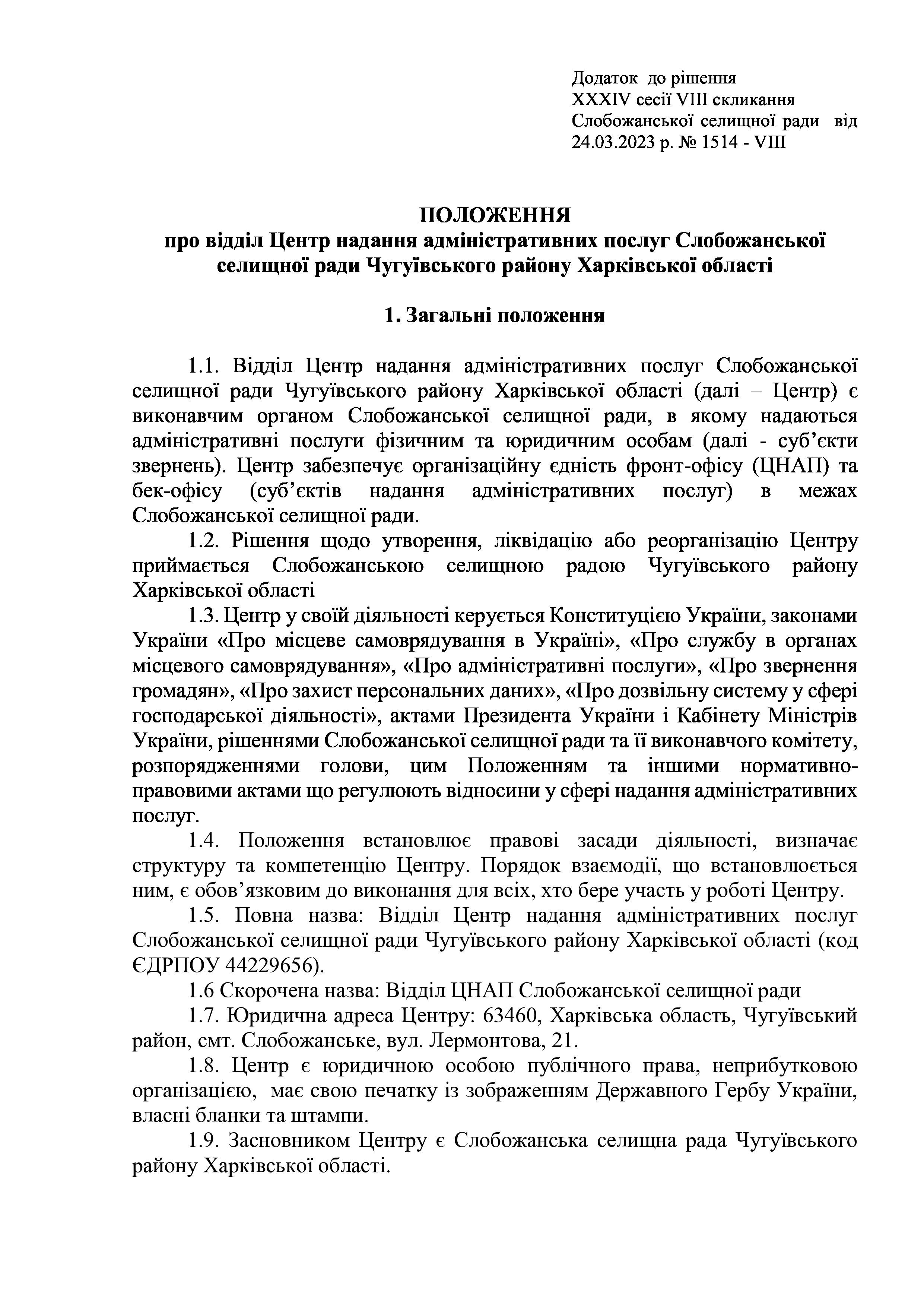 Рішення сесії №1514-VIII Про внесення змін до Положення відділу Центр надання адміністративних послуг Слобожанської селищної ради Чугуївського району Харківської області та затвердження його в новій редакції.