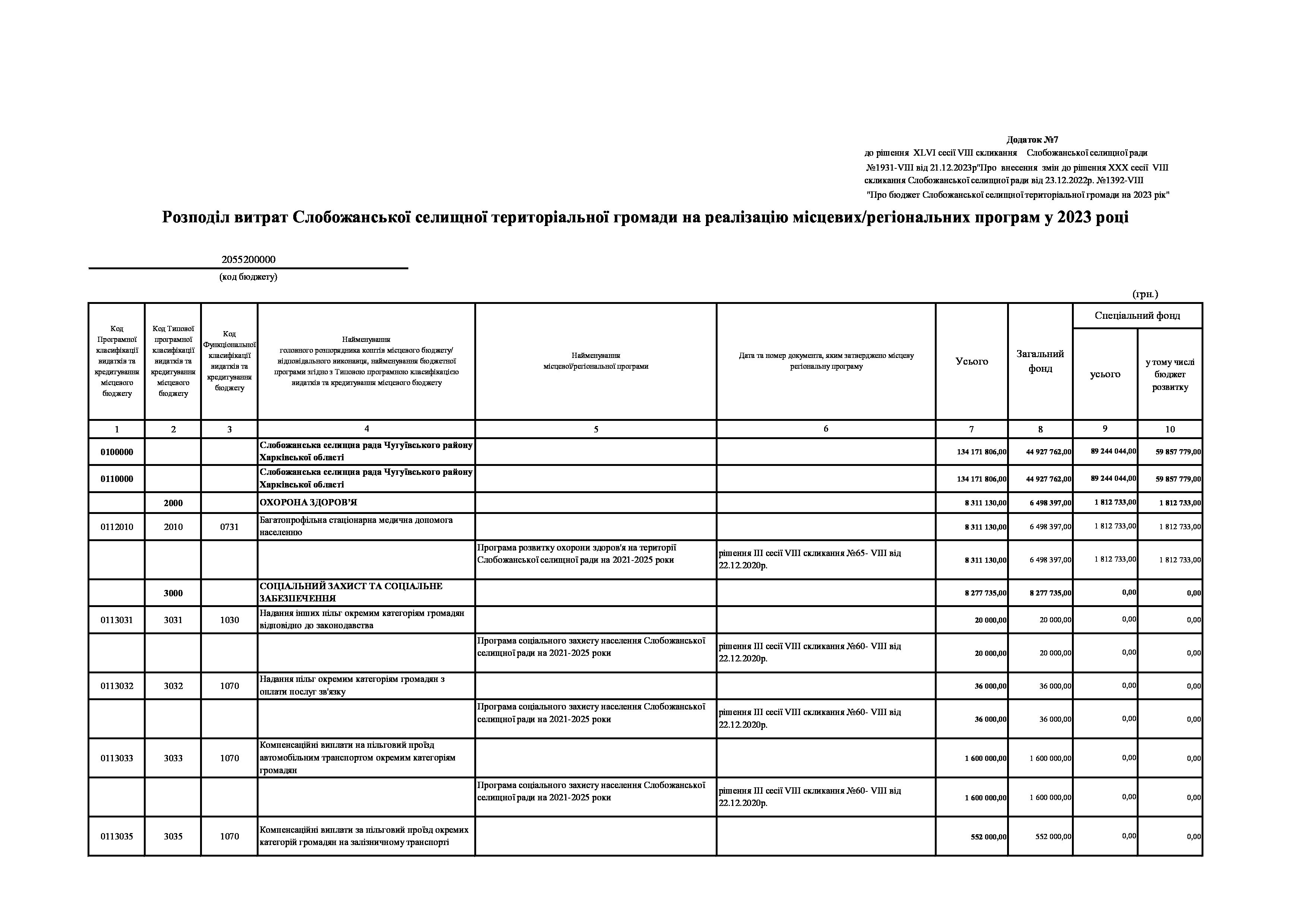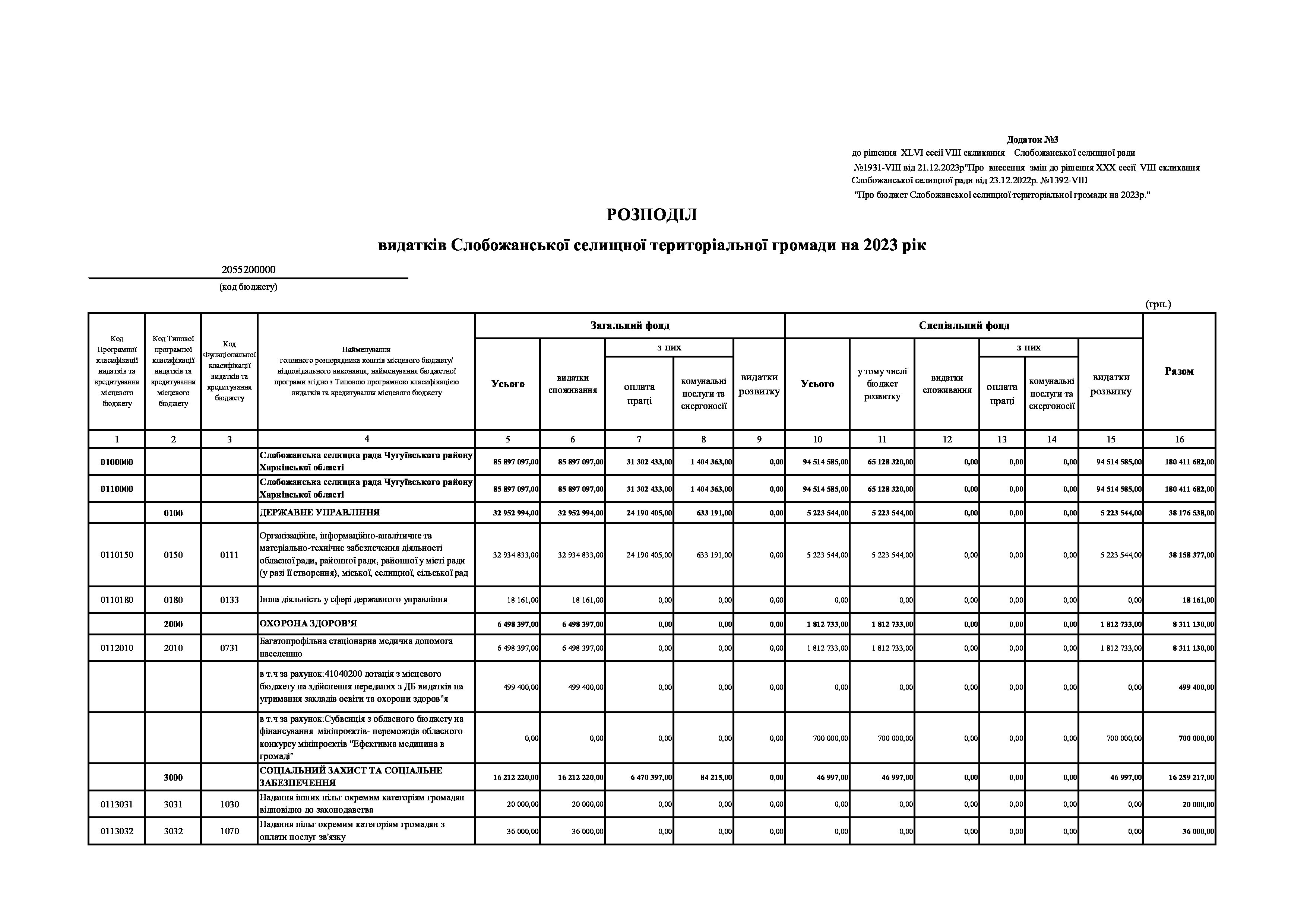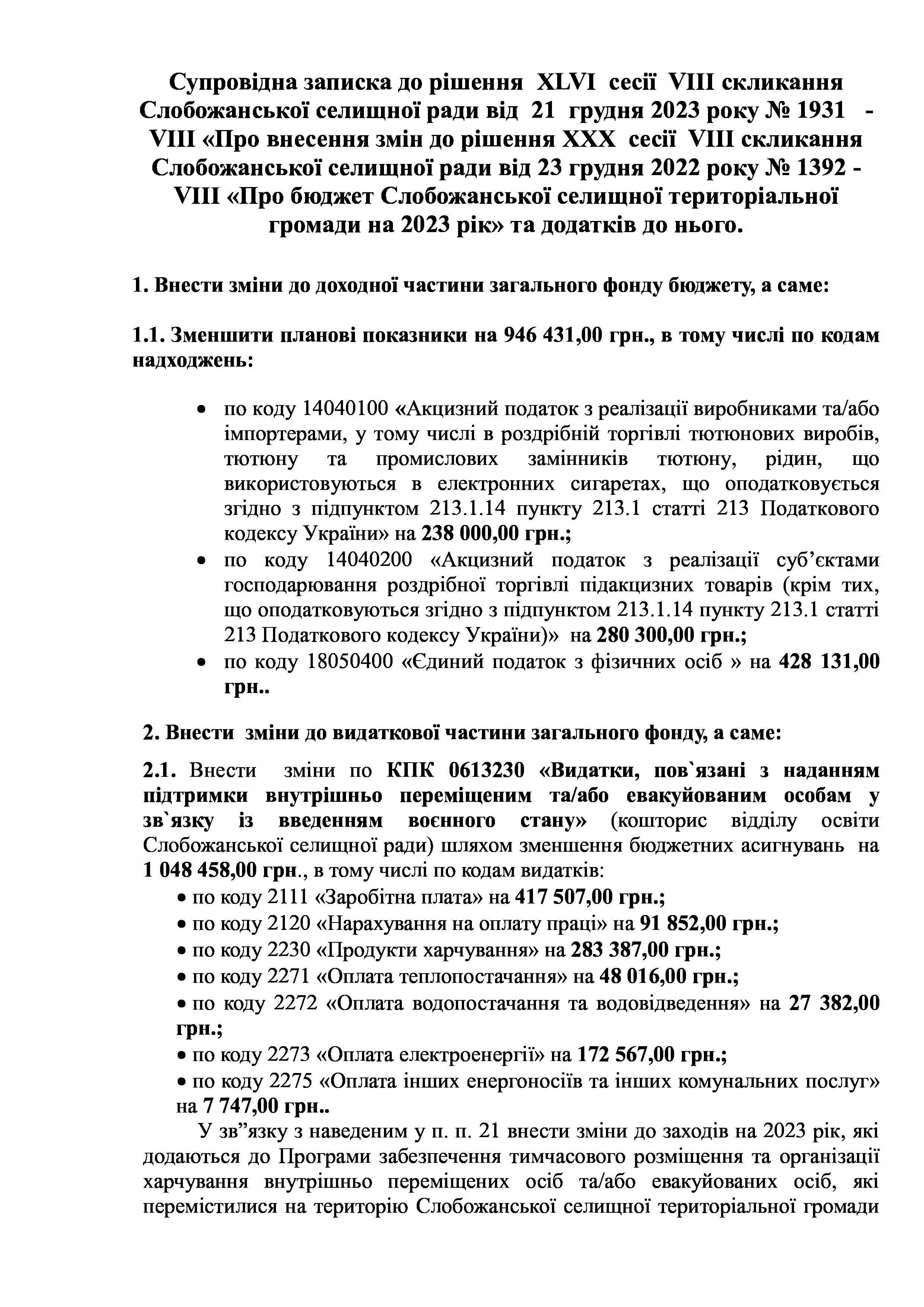 Рішенння сесії №1931-VIII Про внесення змін до рішення ХХХ сесії VIІI скликання Слобожанської селищної ради від 23 грудня 2022 року №1392-VIІI «Про бюджет Слобожанської селищної територіальної громади на 2023 рік».