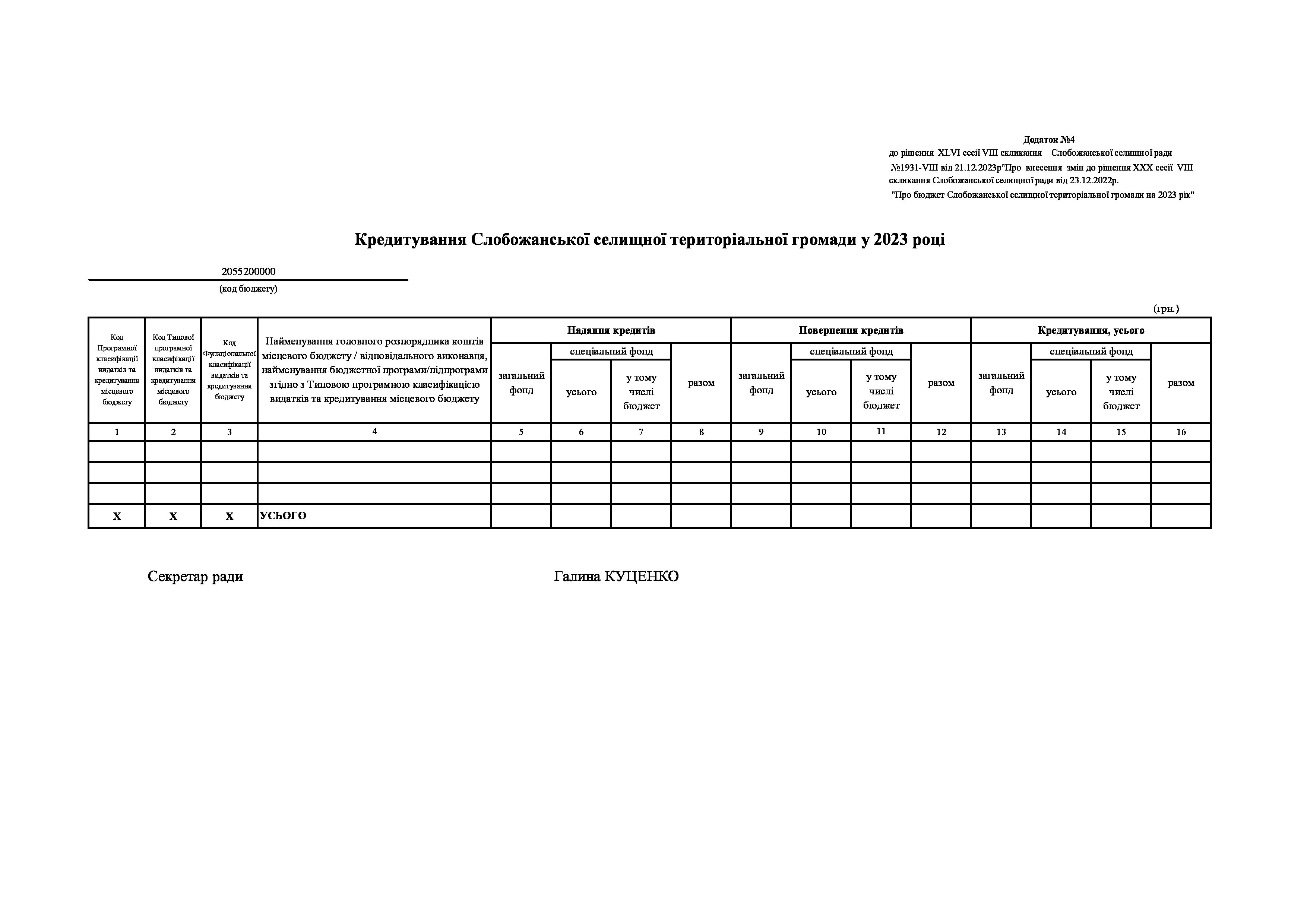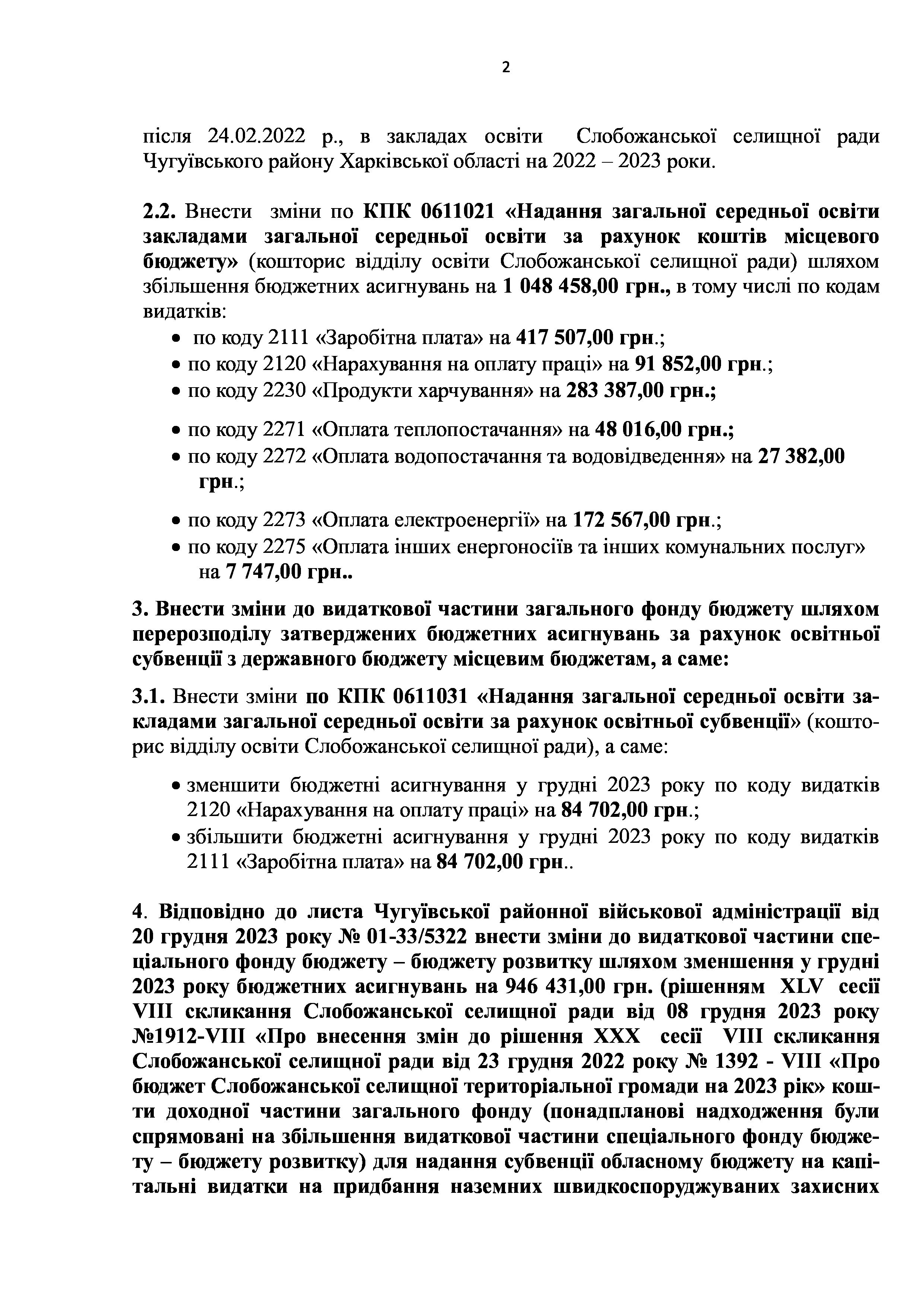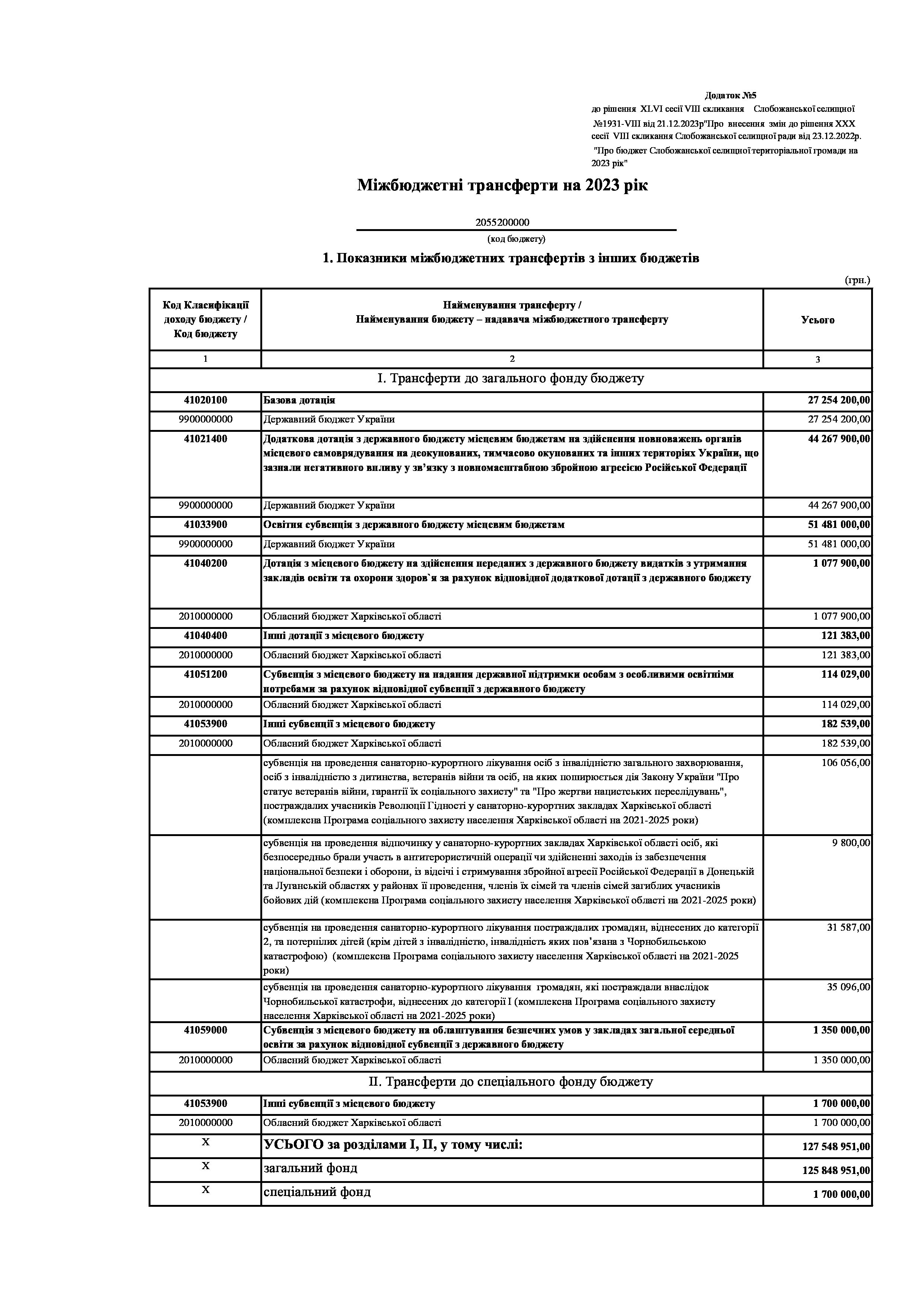 Рішенння сесії №1931-VIII Про внесення змін до рішення ХХХ сесії VIІI скликання Слобожанської селищної ради від 23 грудня 2022 року №1392-VIІI «Про бюджет Слобожанської селищної територіальної громади на 2023 рік».