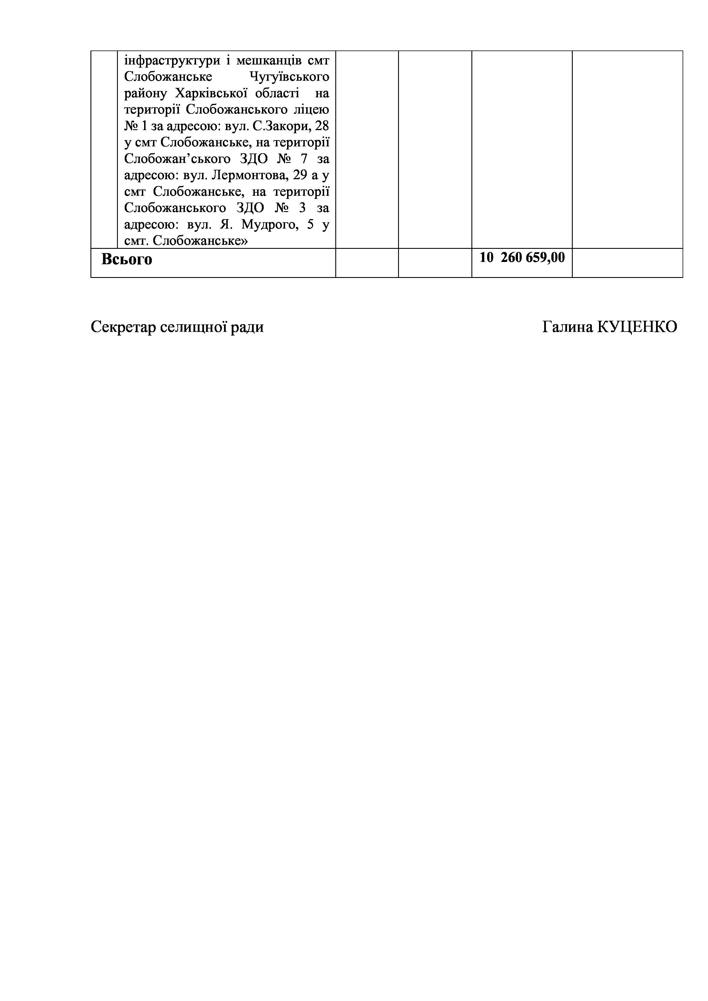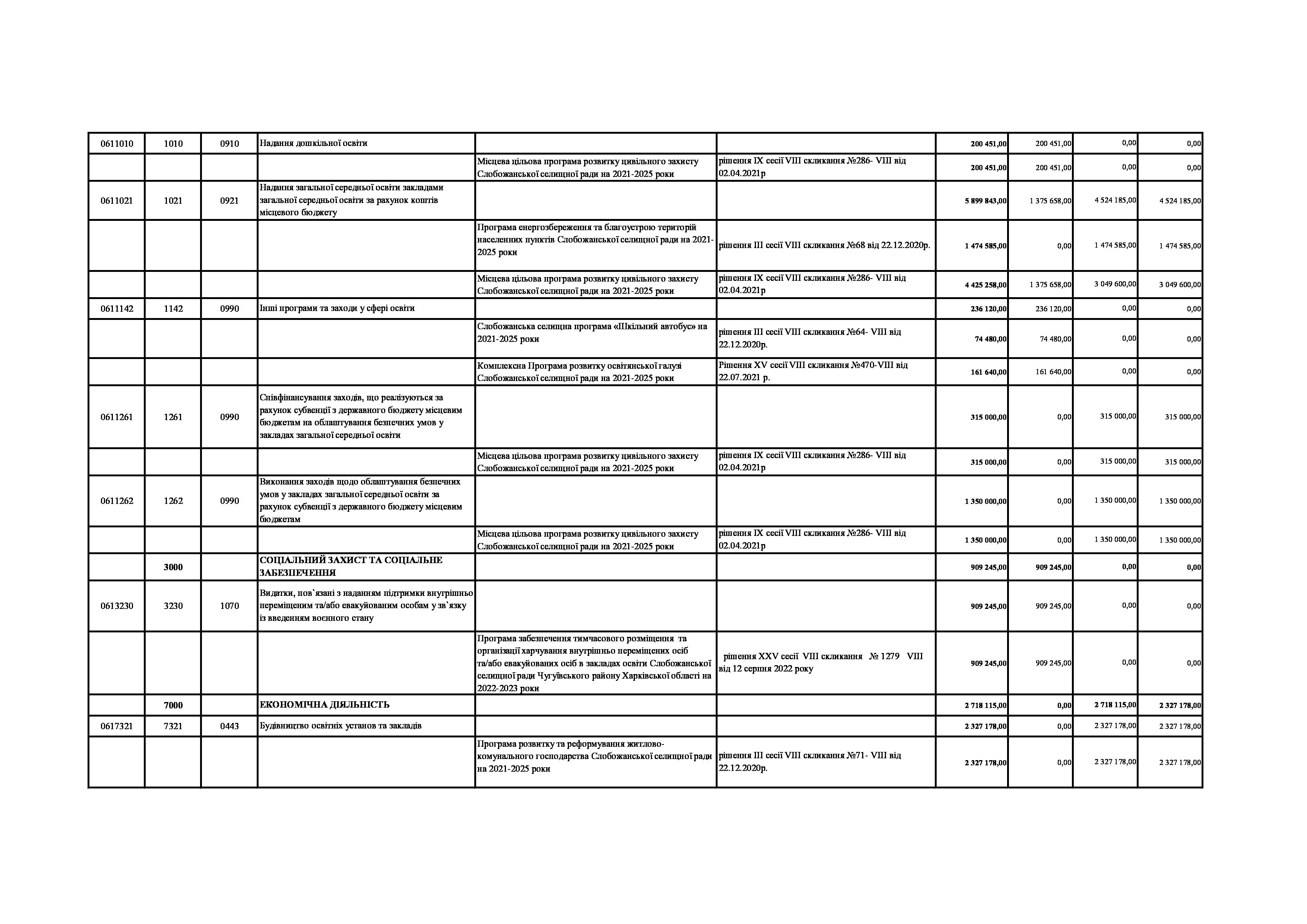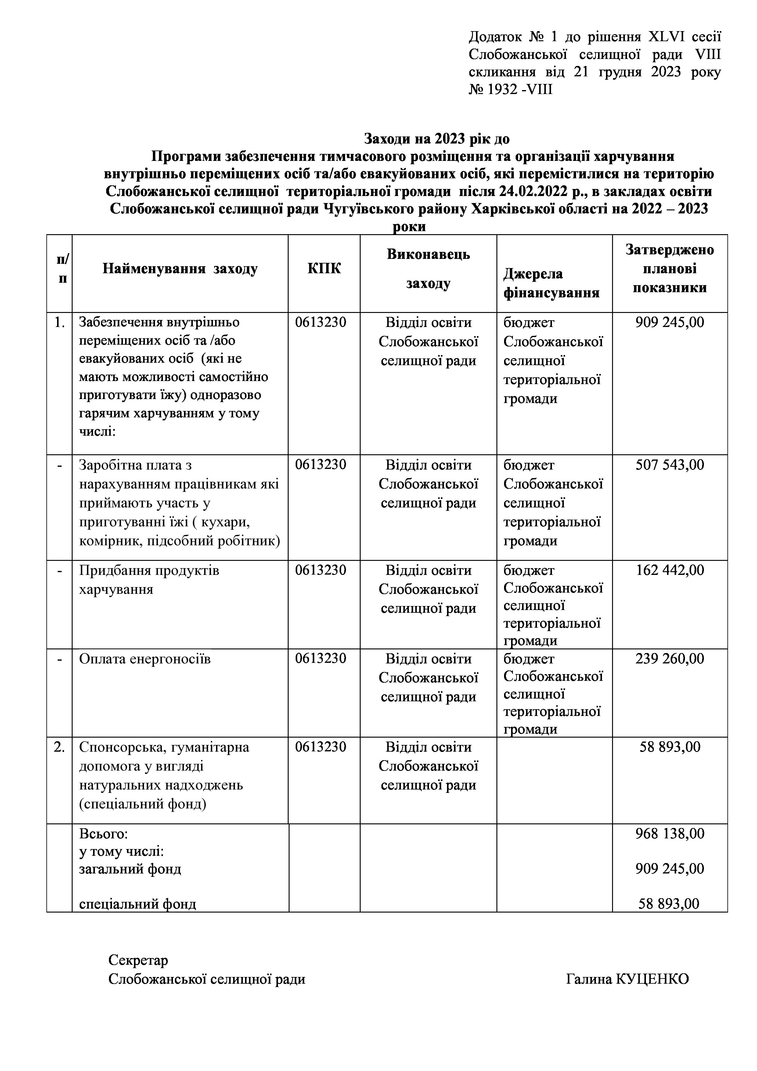 Рішенння сесії №1932-VIII Про внесення змін до Заходів на 2023 рік до Програми забезпечення тимчасового розміщення та організації харчування внутрішньо переміщених осіб та/або евакуйованих осіб, які перемістилися на територію Слобожанської селищної територіальної громади після 24.02.2022 р., в закладах освіти Слобожанської селищної ради Чугуївського району Харківської області на 2022 – 2023 роки.