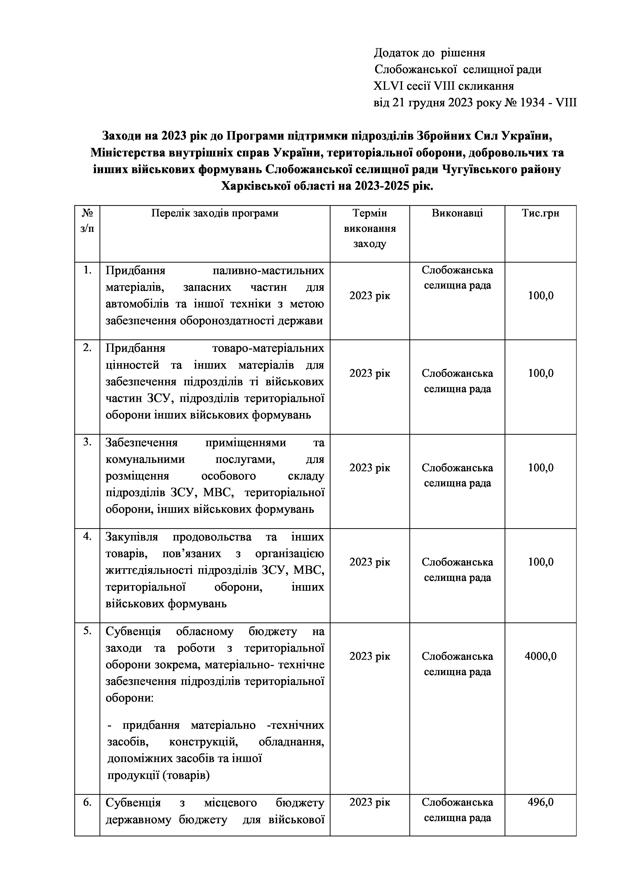 Рішенння сесії №1934-VIII Про внесення змін та доповнень до заходів на 2023 рік до Програми підтримки підрозділів Збройних Сил України, Міністерства внутрішніх справ України, територіальної оборони, добровольчих та інших військових формувань Слобожанської селищної ради Чугуївського району Харківської області на 2023-2025 роки.