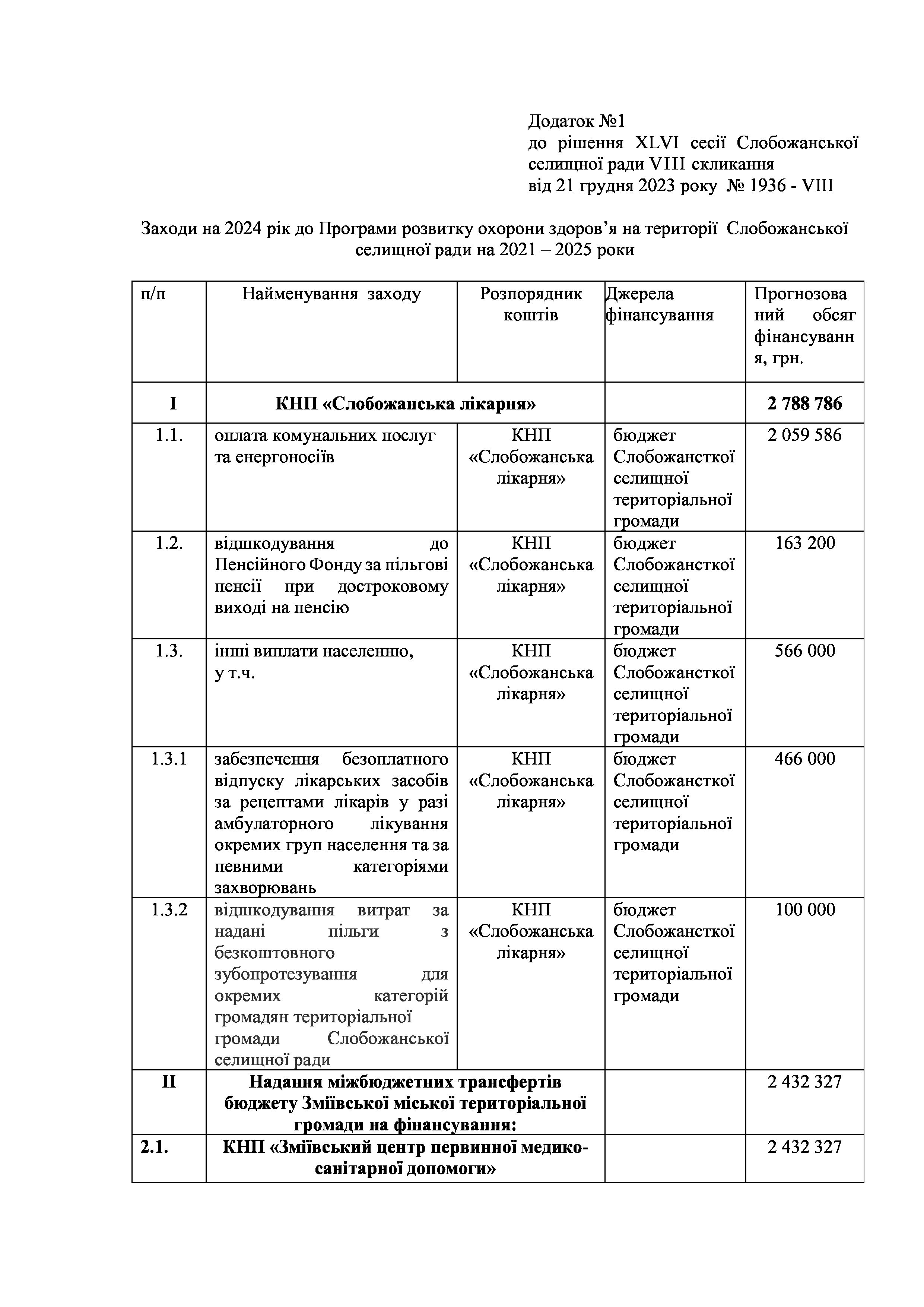 Рішенння сесії №1936-VIII Про затвердження Заходів на 2024 рік до Програми розвитку охорони здоров’я на території Слобожанської селищної ради на 2021-2025 роки.
