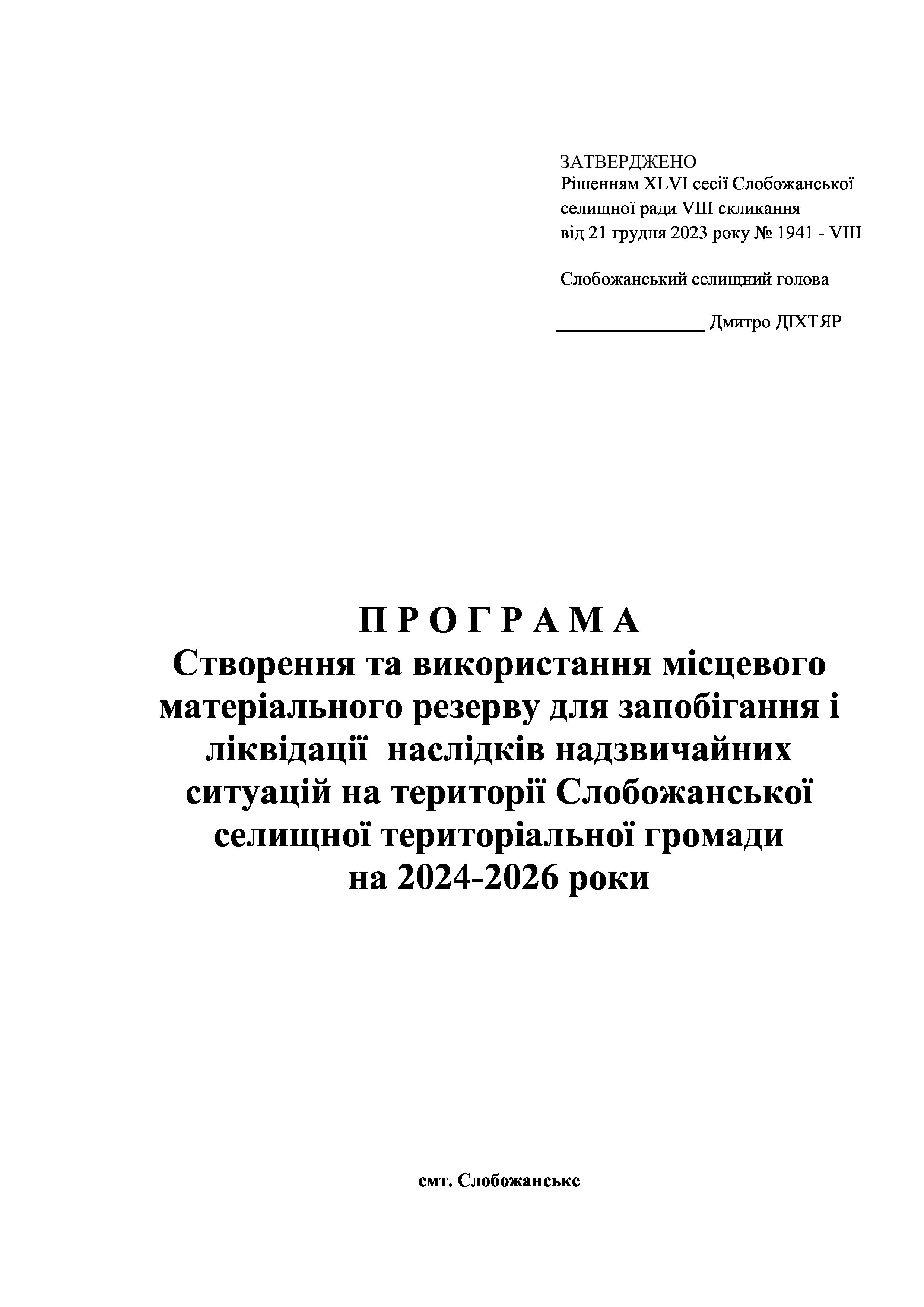 Рішенння сесії №1941-VIII Про затвердження Програми створення і використання місцевого матеріального резерву для запобігання і ліквідації наслідків надзвичайних ситуацій на території Слобожанської селищної територіальної громади на 2024 - 2026 роки».