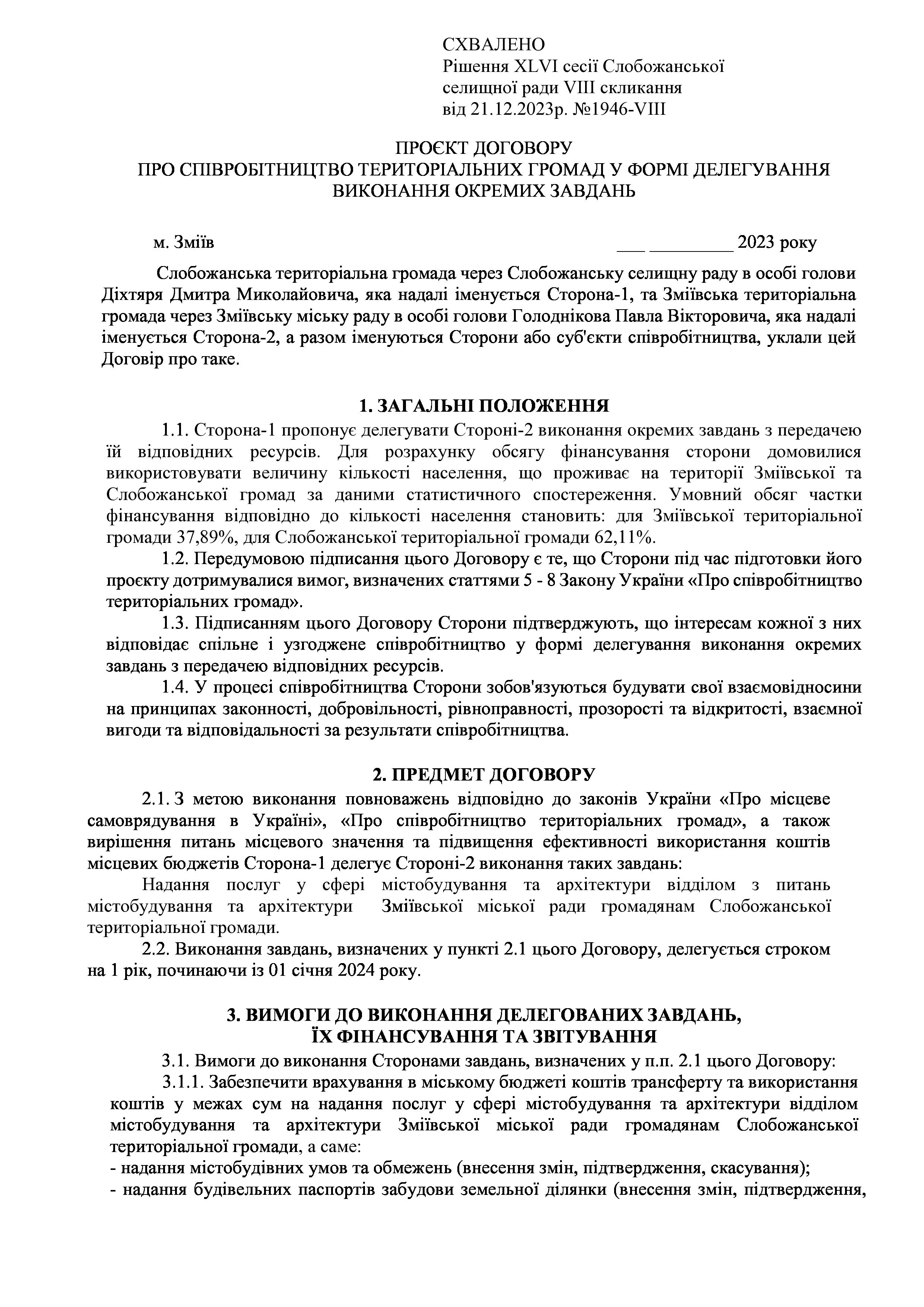 Рішенння сесії №1946-VIII Про схвалення проєкту договору про співробітництво територіальних громад Слобожанської селищної ради та Зміївської міської ради.