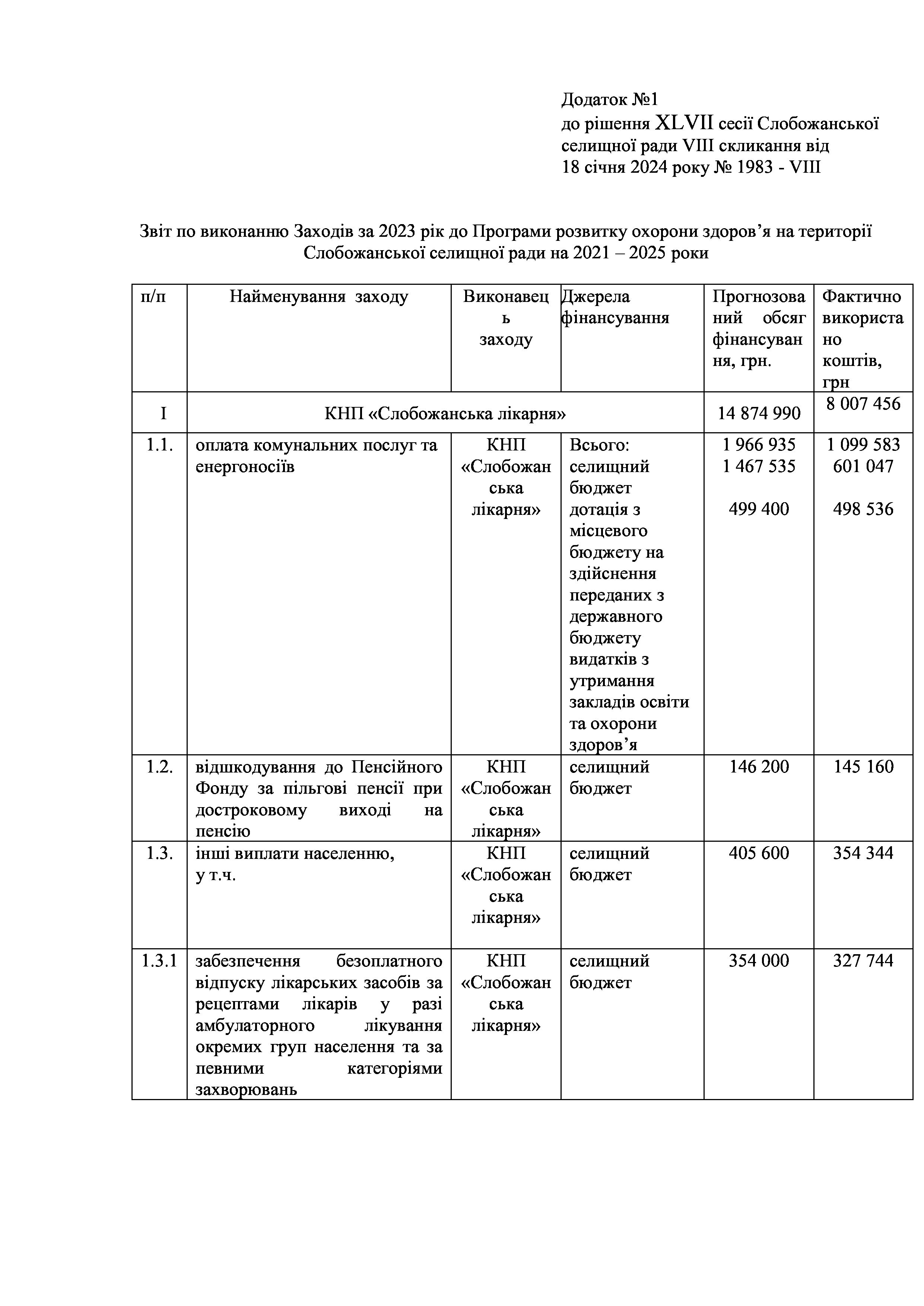 Рішення сесії №1983 Про затвердження звіту про виконання Заходів за 2023 рік до Програми розвитку охорони здоров’я на території Слобожанської селищної ради на 2021 -2025 роки.