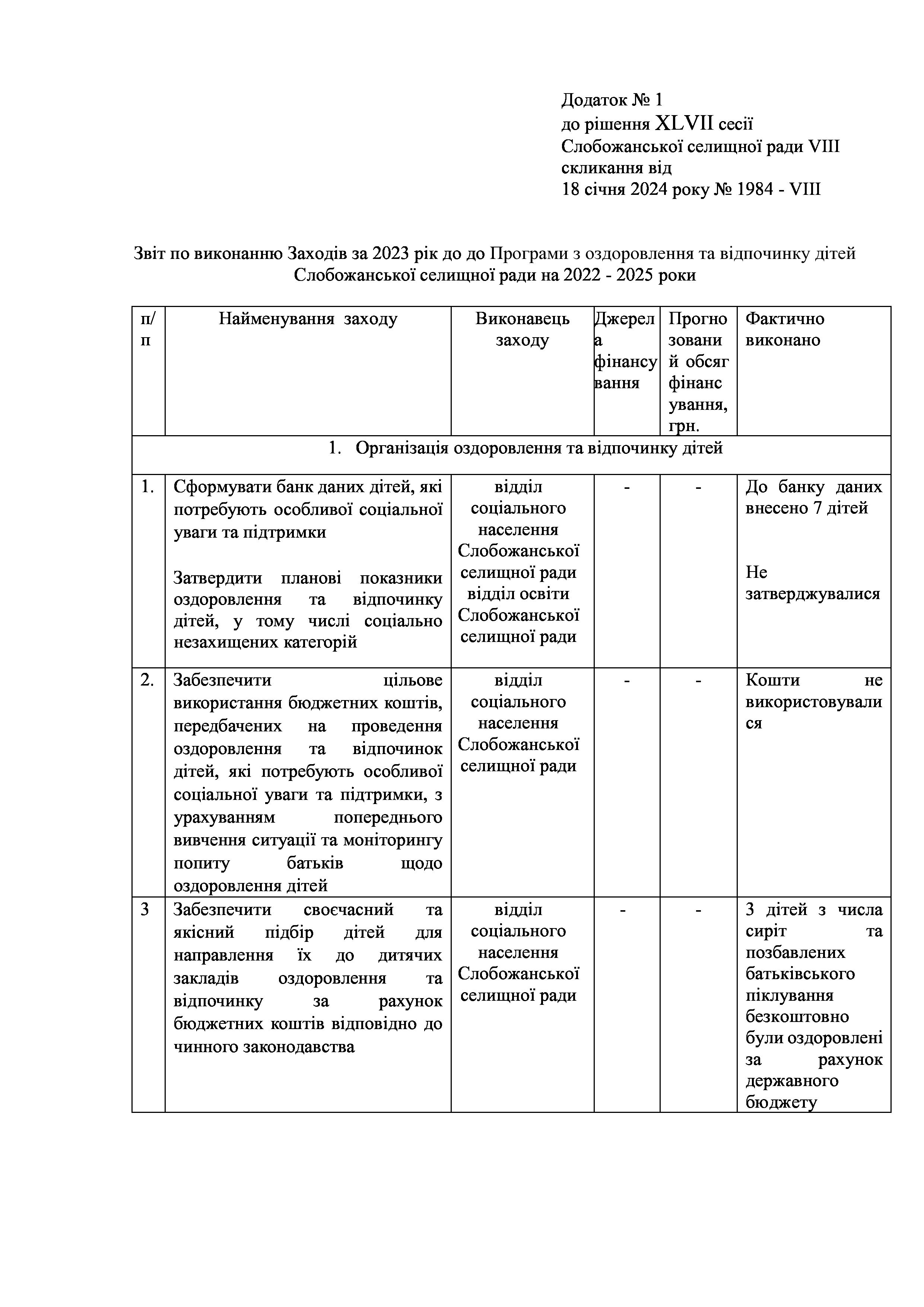Рішення сесії №1984 Про затвердження звіту про виконання Заходів за 2023 рік до Програми оздоровлення та відпочинку дітей Слобожанської селищної ради на 2022-2025 роки.
