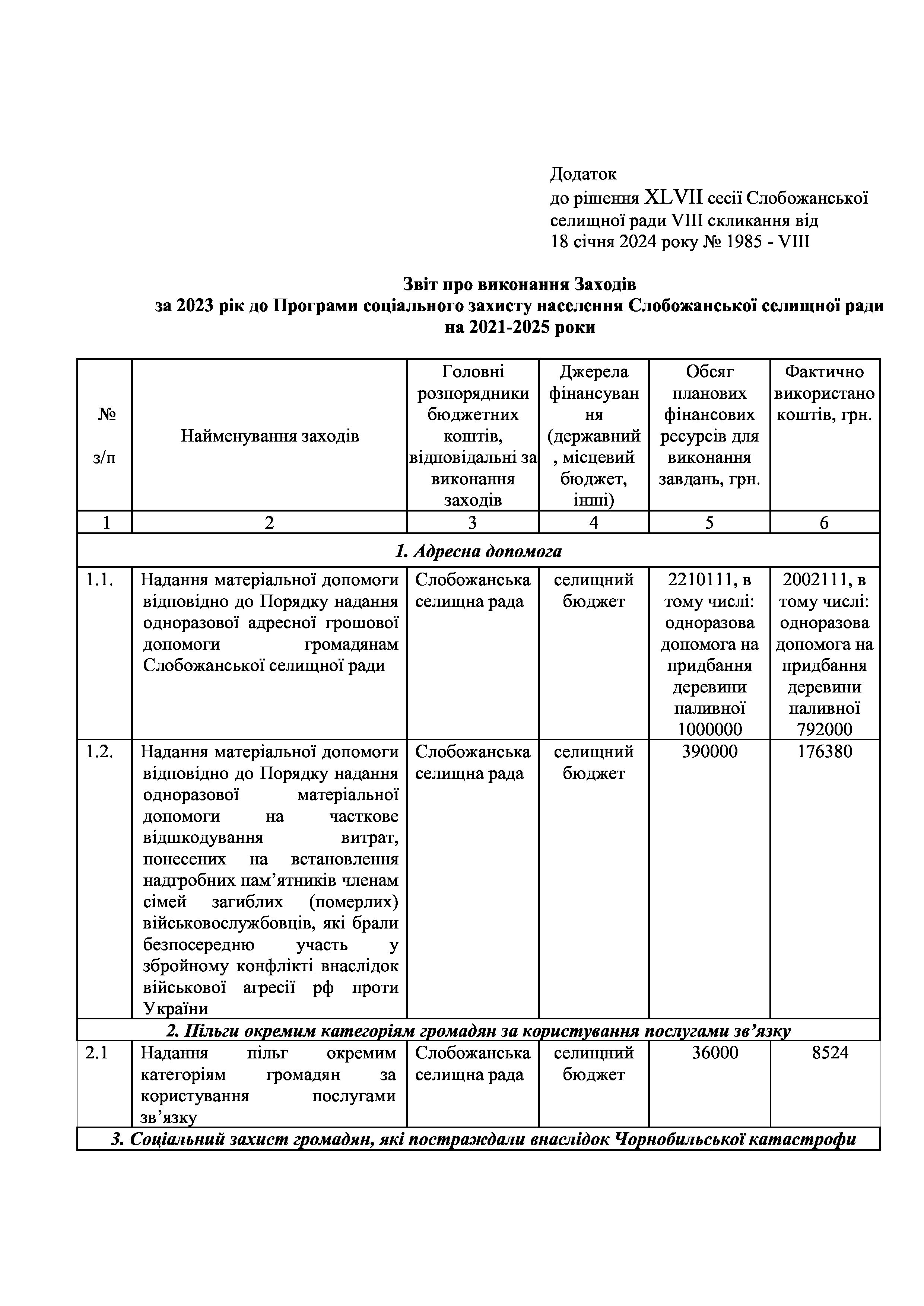 Рішення сесії №1985 Про затвердження звіту про виконання Заходів за 2023 рік до Програми соціального захисту населення Слобожанської селищної ради на 2021-2025 роки.