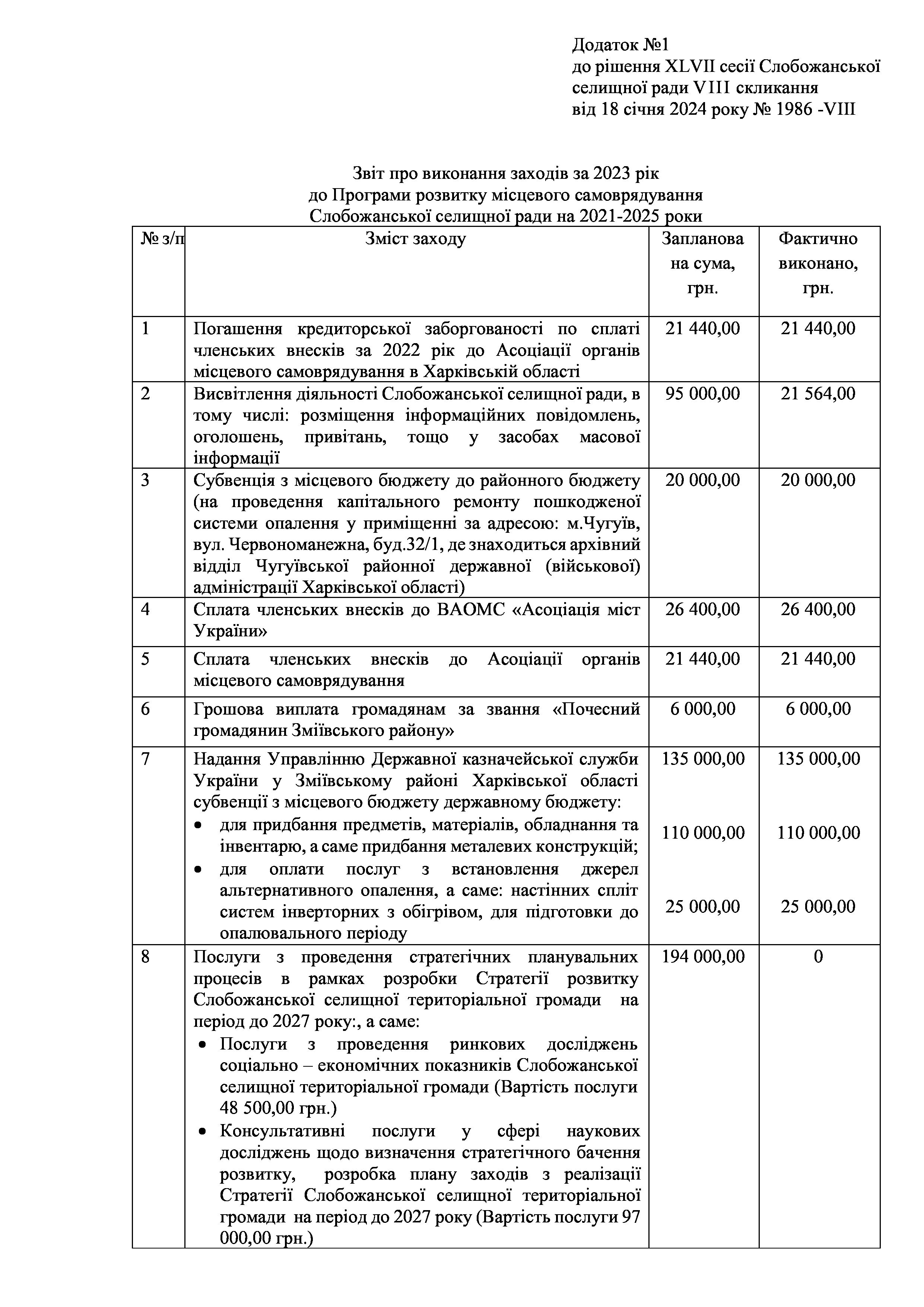 Рішення сесії №1986 Про затвердження звіту про виконання заходів на 2023 рік до Програми розвитку місцевого самоврядування Слобожанської селищної ради на 2021-2025 роки.