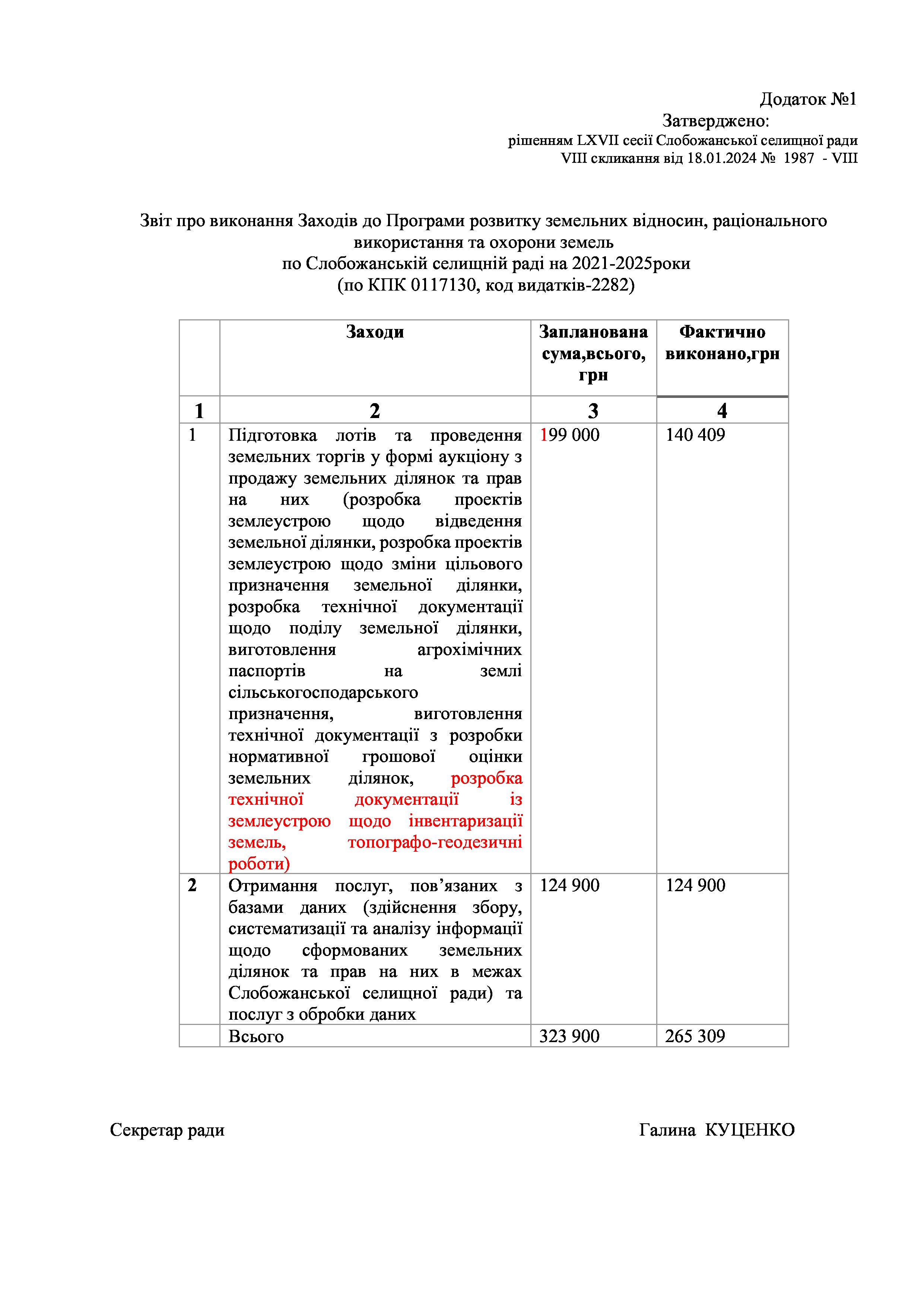 Рішення сесії №1987 Про затвердження звіту про Заходи до Програми земельних відносин, раціонального використання та охорони земель по Слобожанській селищній раді на 2021-2025 роки.
