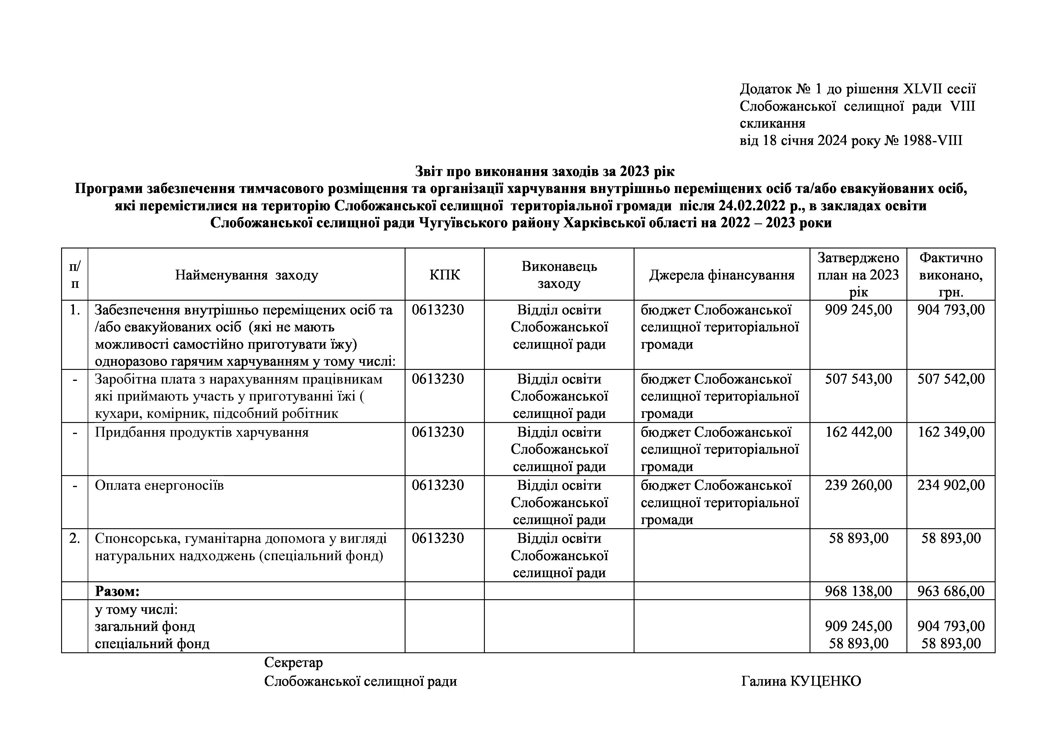 Рішення сесії №1988 Про затвердження звіту про виконання заходів за 2023 рік до Програми забезпечення тимчасового розміщення та організації харчування внутрішньо переміщених осіб та/або евакуйованих осіб, які перемістилися на територію Слобожанської селищної територіальної громади після 24.02.2022 р., в закладах освіти Слобожанської селищної ради Чугуївського району Харківської області на 2022 – 2023 роки.