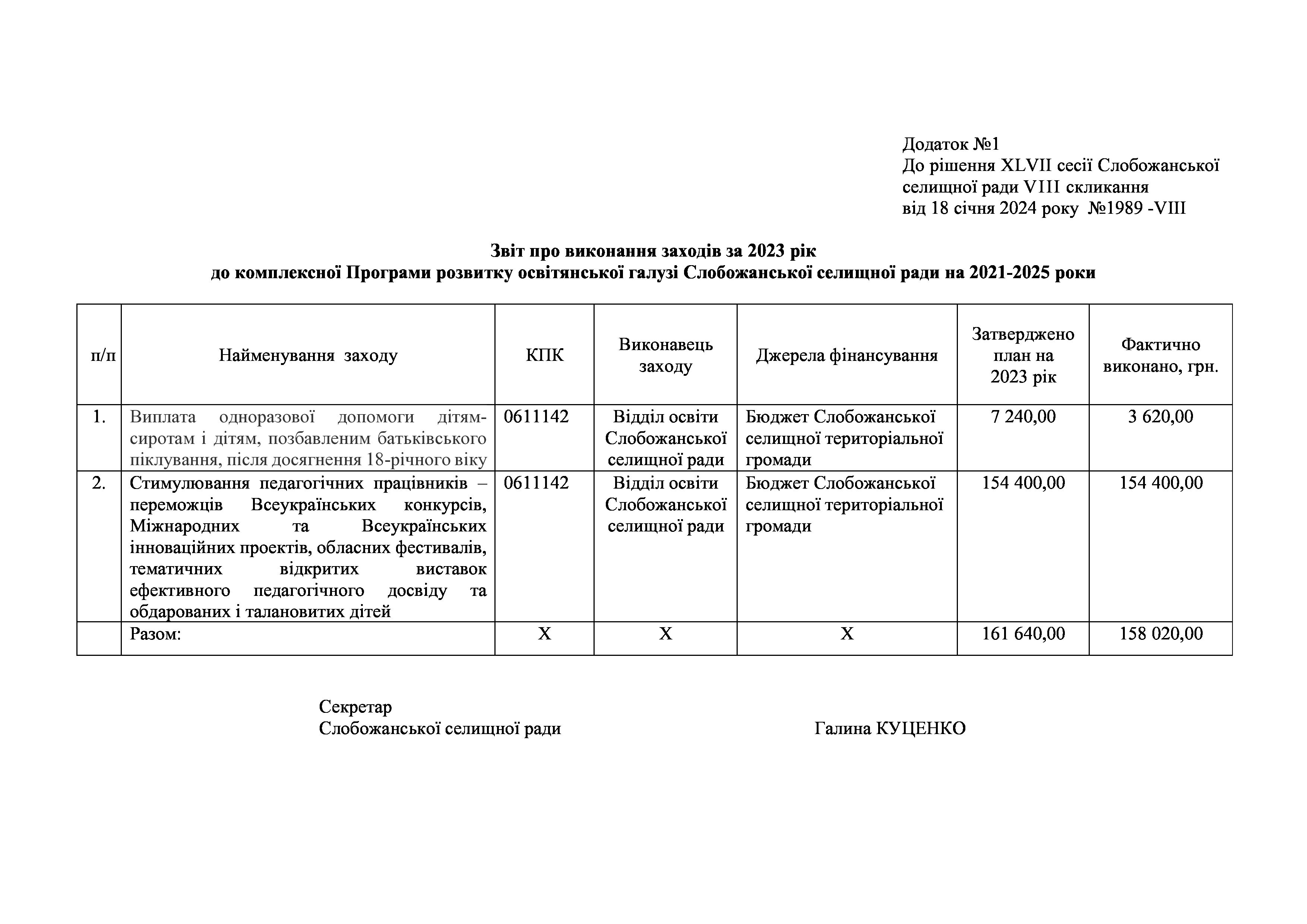 Рішення сесії №1989 Про затвердження звіту про виконання заходів за 2023 рік до комплексної Програми розвитку освітянської галузі Слобожанської селищної ради на 2021-2025 роки.