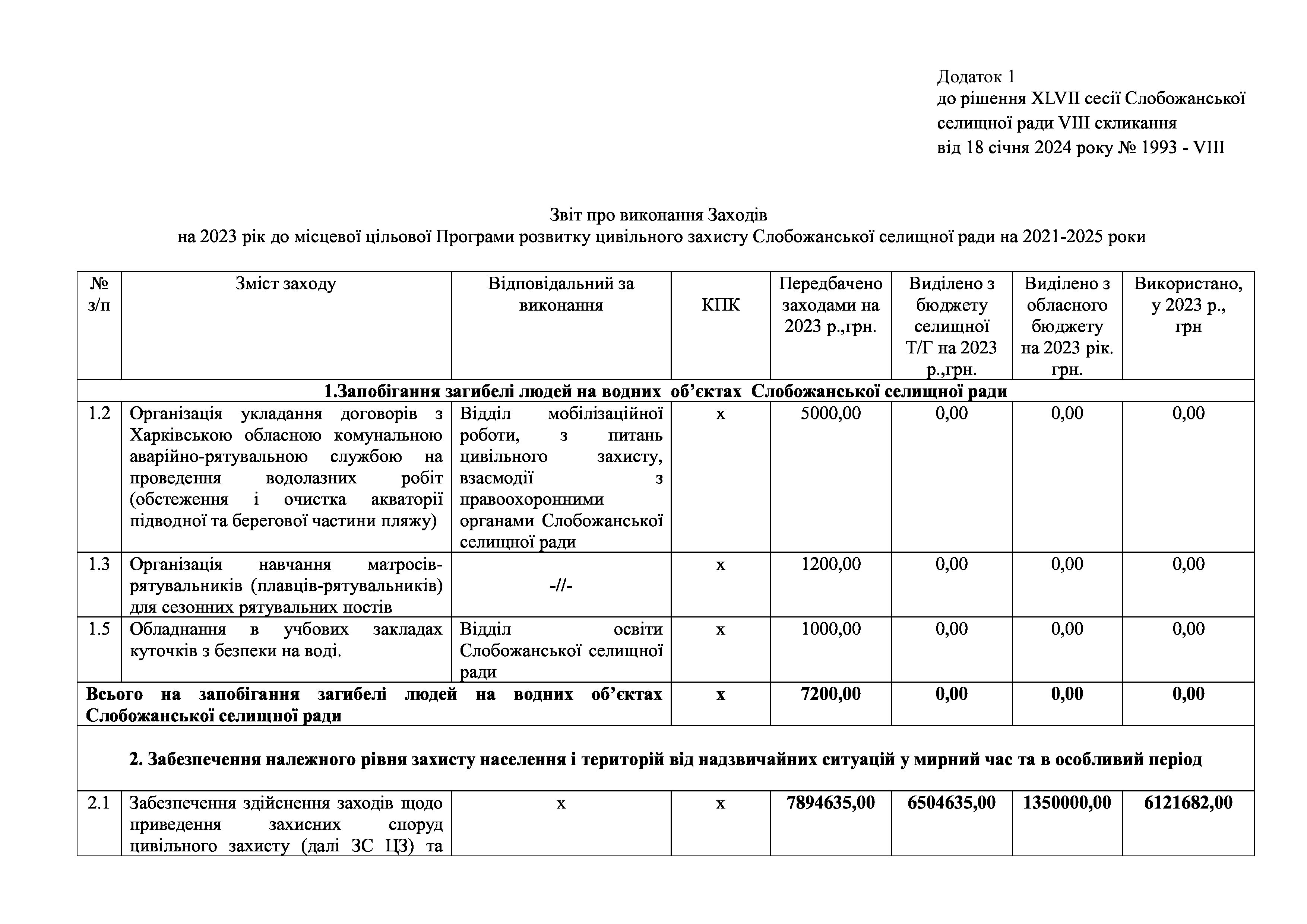Рішення сесії №1993 Про затвердження звіту про виконання Заходів на 2023 рік до місцевої цільової Програми розвитку цивільного захисту Слобожанської селищної ради на 2021-2025 роки.
