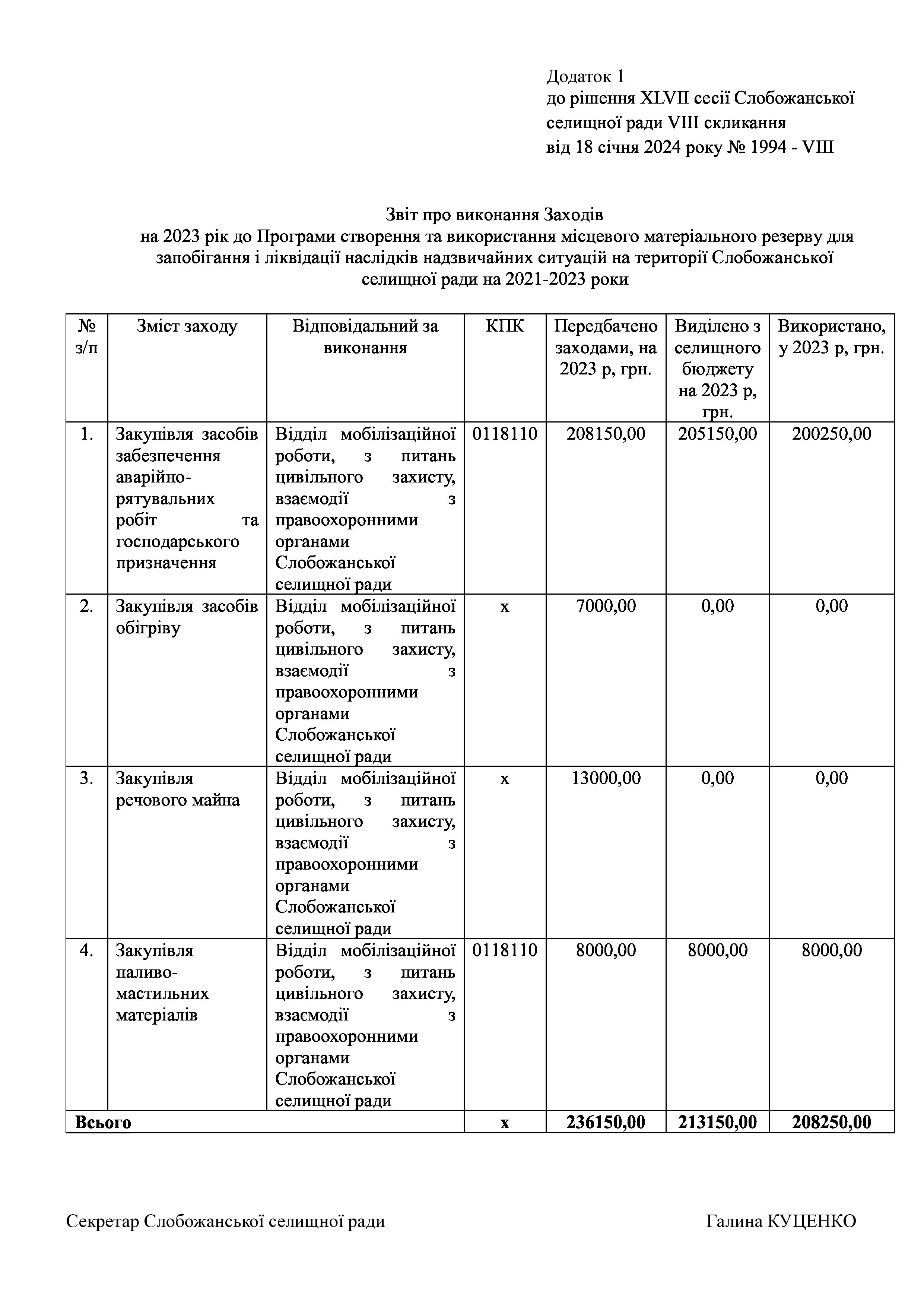 Рішення сесії №1994 Про затвердження звіту про виконання Заходів на 2023 рік до Програми створення та використання місцевого матеріального резерву для запобігання і ліквідації наслідків надзвичайних ситуацій на території Слобожанської селищної ради на 2021-2023 роки.