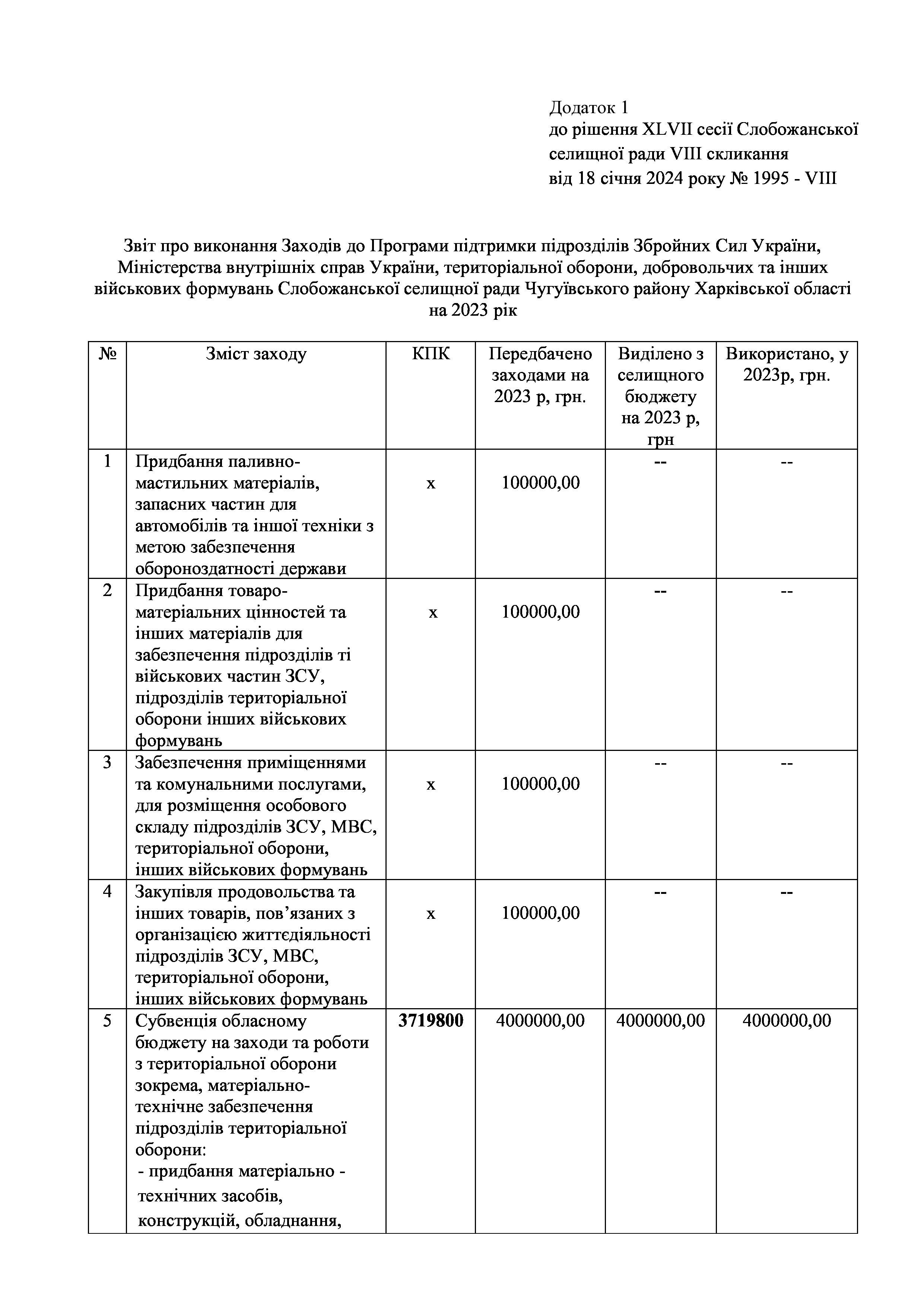 Рішення сесії №1995 Про затвердження звіту про виконання Заходів на 2023 рік до Програми підтримки підрозділів Збройних Сил України, Міністерства внутрішніх справ України, територіальної оборони, добровольчих та інших військових формувань Слобожанської селищної ради Чугуївського району Харківської області на 2023-2025 роки.