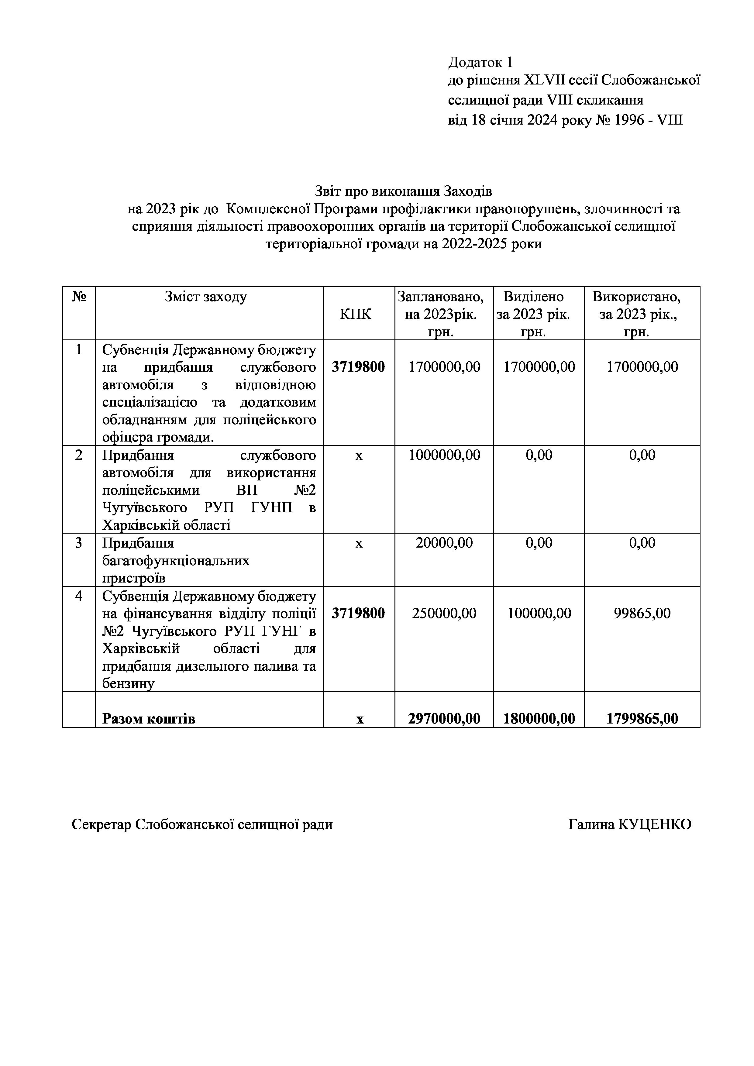 Рішення сесії №1996 Про затвердження звіту про виконання Заходів на 2023 рік до комплексної Програми профілактики правопорушень, злочинності та сприяння діяльності правоохоронних органів на території Слобожанської селищної територіальної громади на 2022-2025 роки.