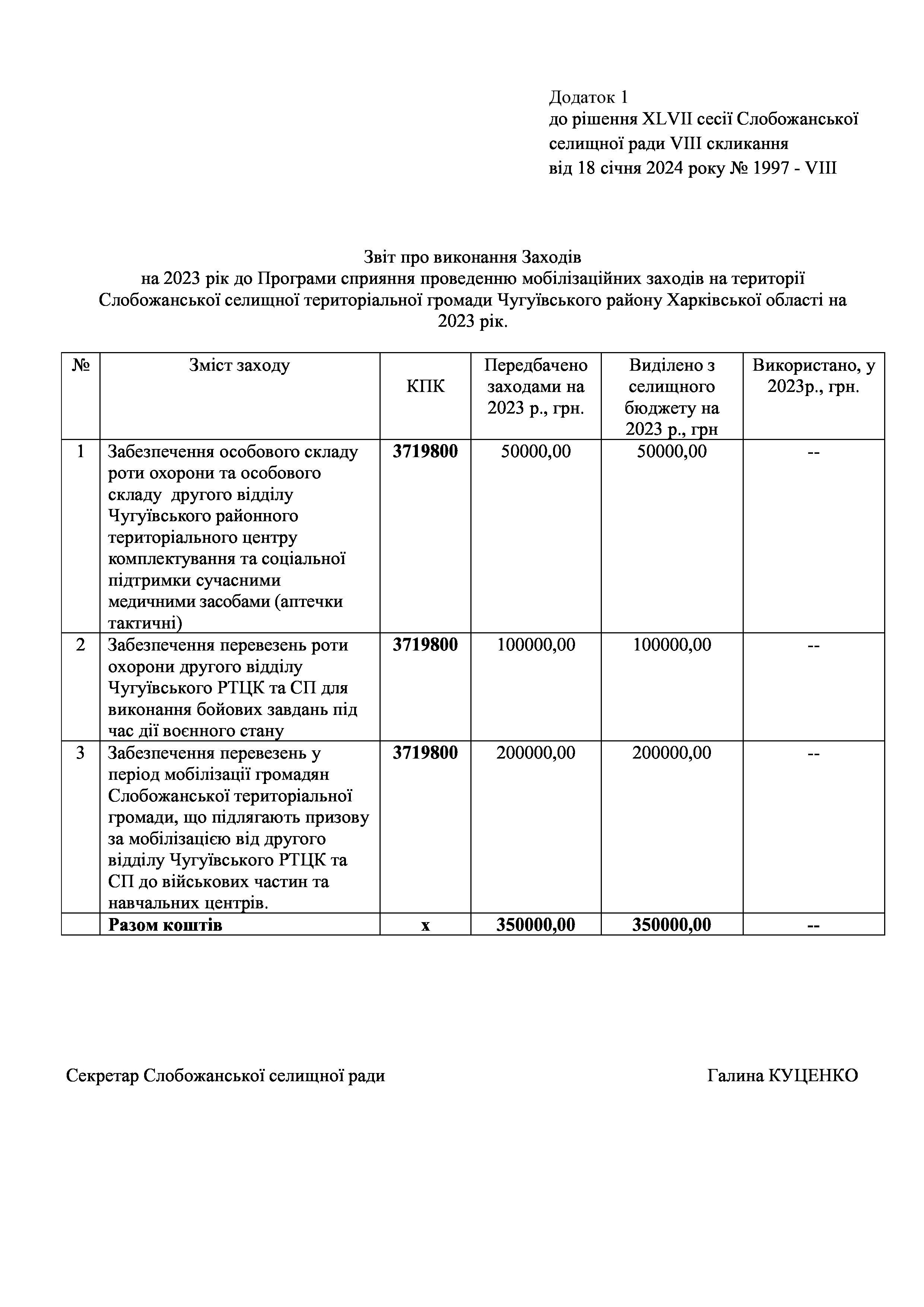 Рішення сесії №1997 Про затвердження звіту про виконання Заходів на 2023 рік до Програми сприяння проведенню мобілізаційних заходів на території Слобожанської селищної територіальної громади Чугуївського району Харківської області на 2023 рік.