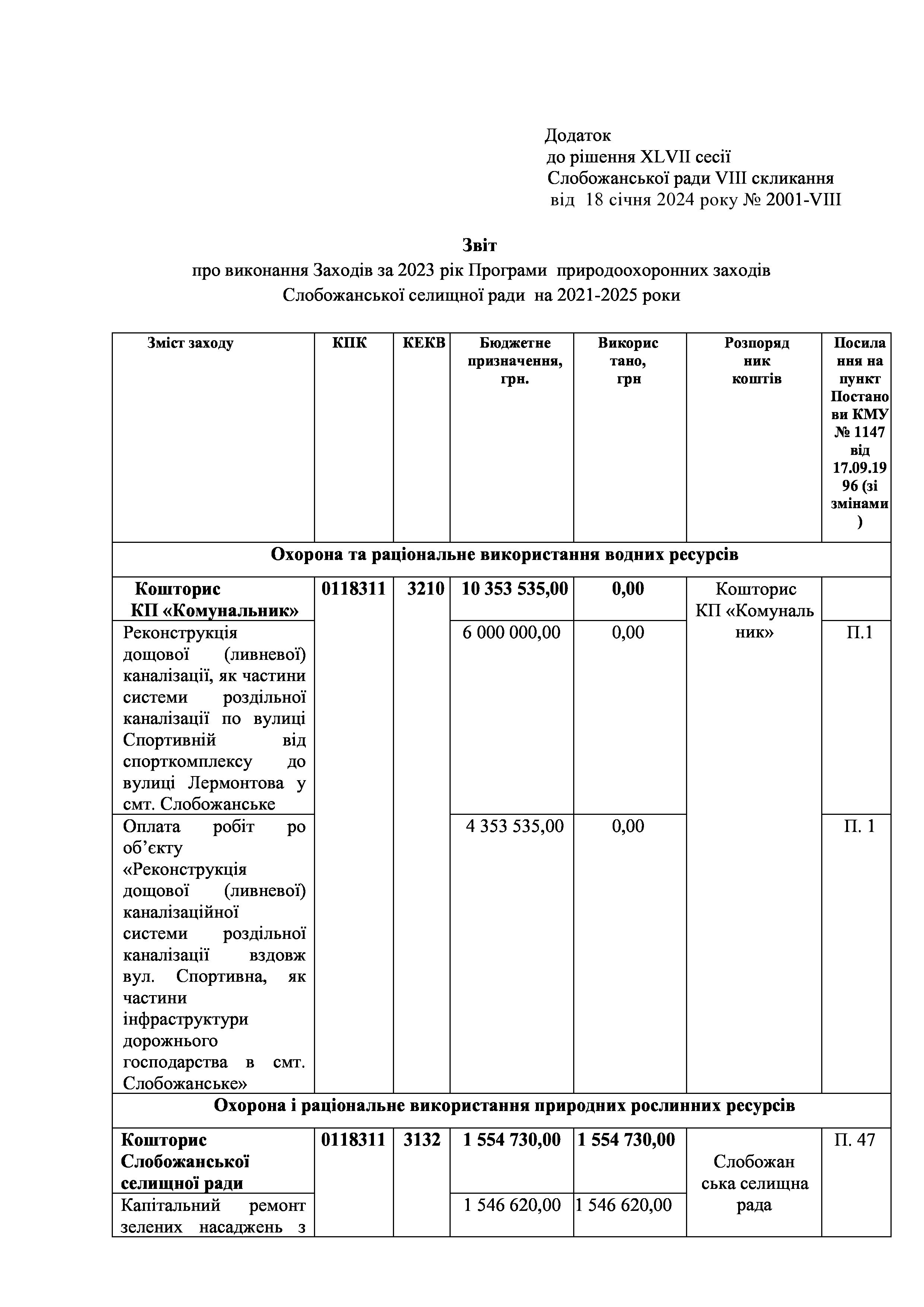 Рішення сесії №2001 Про затвердження звіту про виконання Заходів за 2023 рік до Програми природоохоронних заходів Слобожанської селищної ради на 2021-2025 роки.