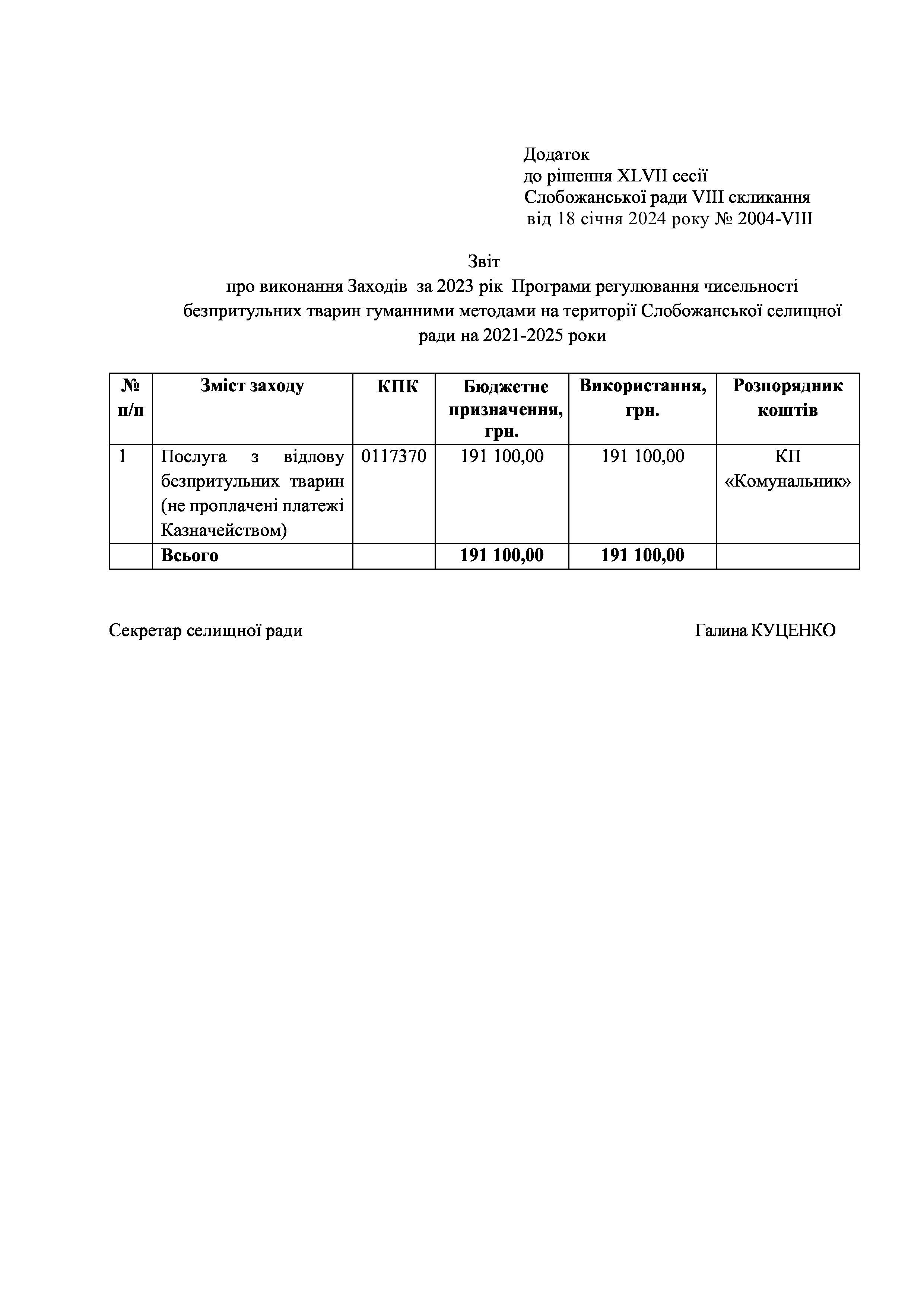 Рішення сесії №2004 Про затвердження звіту про виконання Заходів за 2023 рік до Програми регулювання чисельності безпритульних тварин гуманними методами на території Слобожанської селищної ради на 2021-2025 роки.