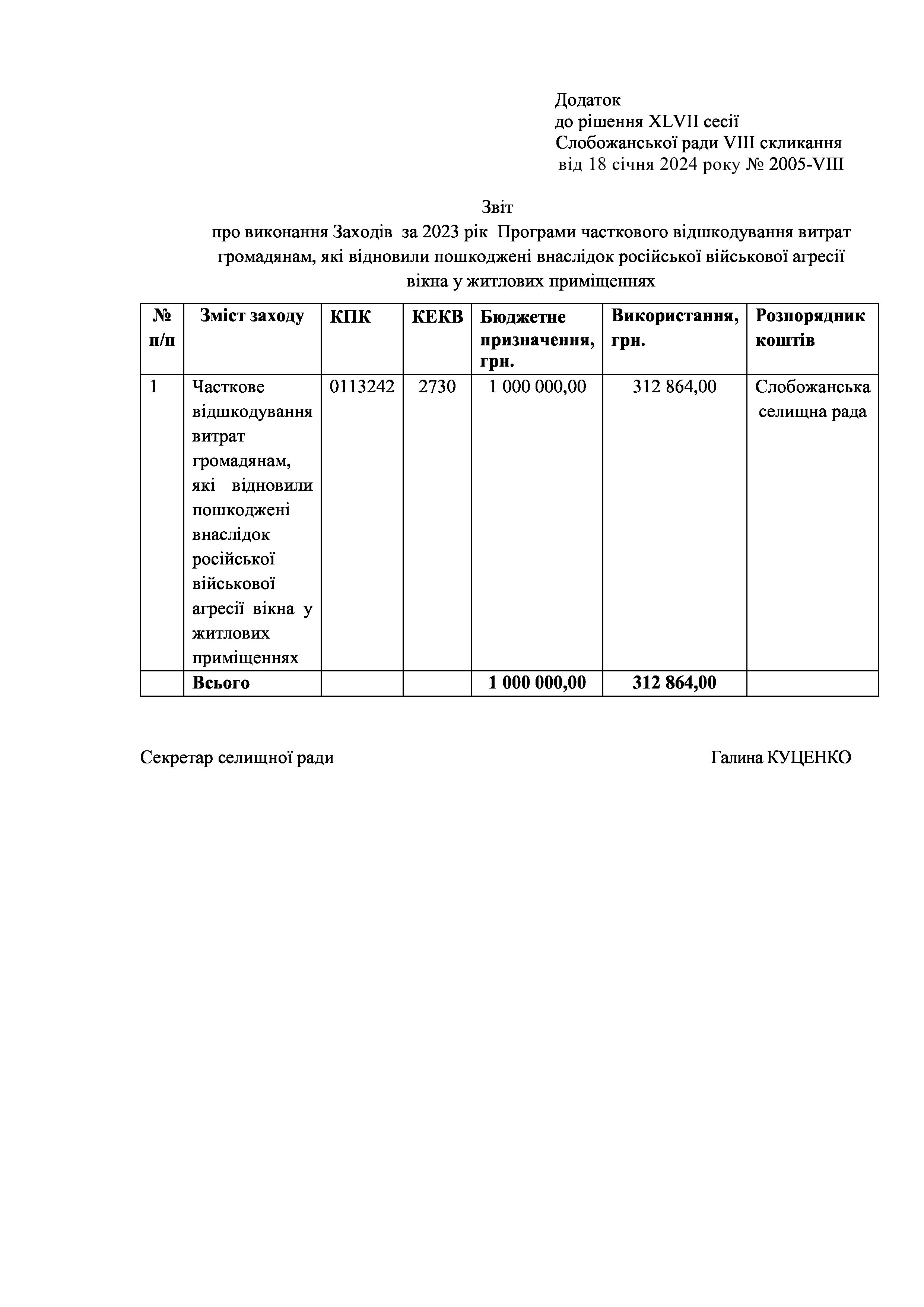 Рішення сесії №2005 Про затвердження звіту про виконання Заходів за 2023 рік до Програми часткового відшкодування витрат громадянам, які відновили пошкоджені внаслідок російської військової агресії вікна у житлових приміщеннях.