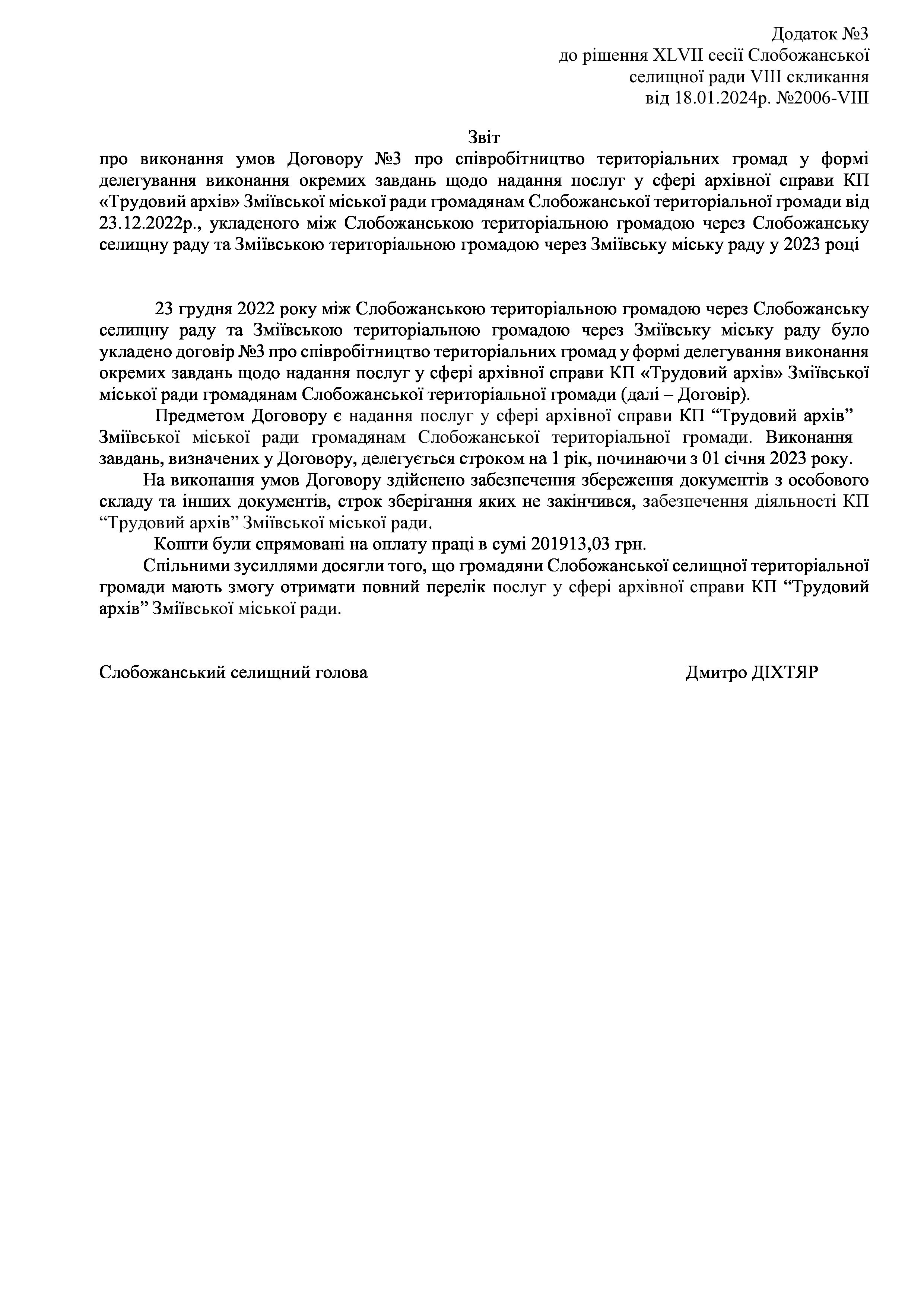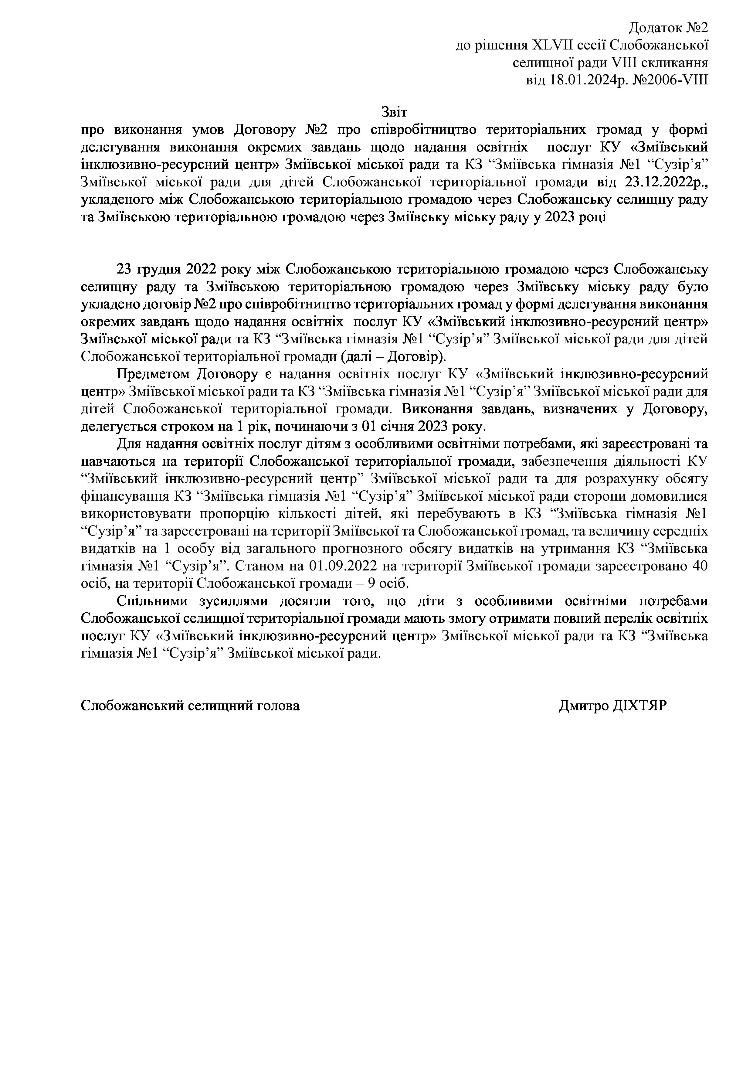 Рішення сесії №2041 Про Звіт Слобожанського селищного голови Дмитра ДІХТЯРА за 2023 рік.