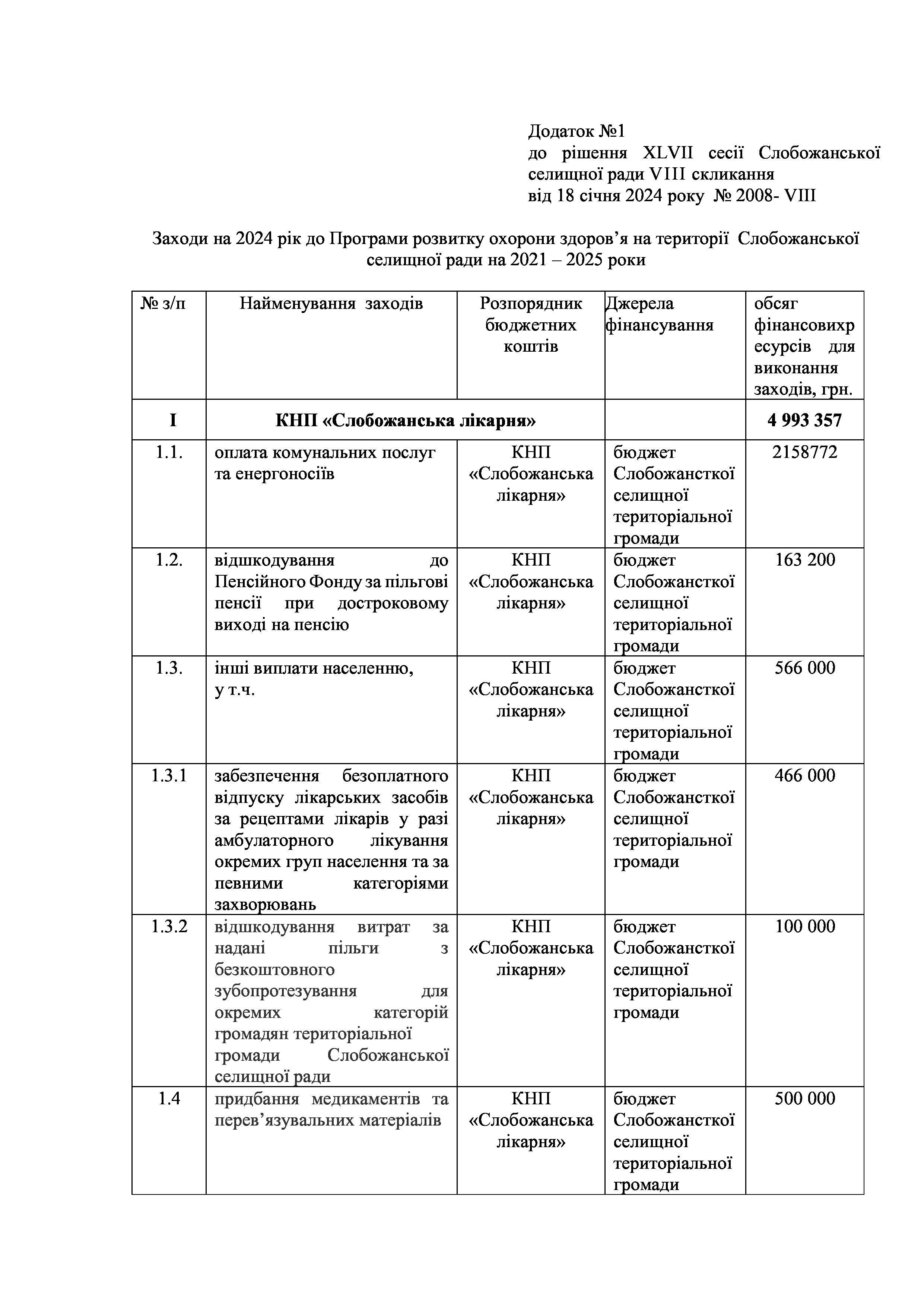 Рішення сесії №2008 Про внесення змін та доповнень до Заходів на 2024 рік до Програми розвитку охорони здоров’я на території Слобожанської селищної ради на 2021 - 2025 роки.