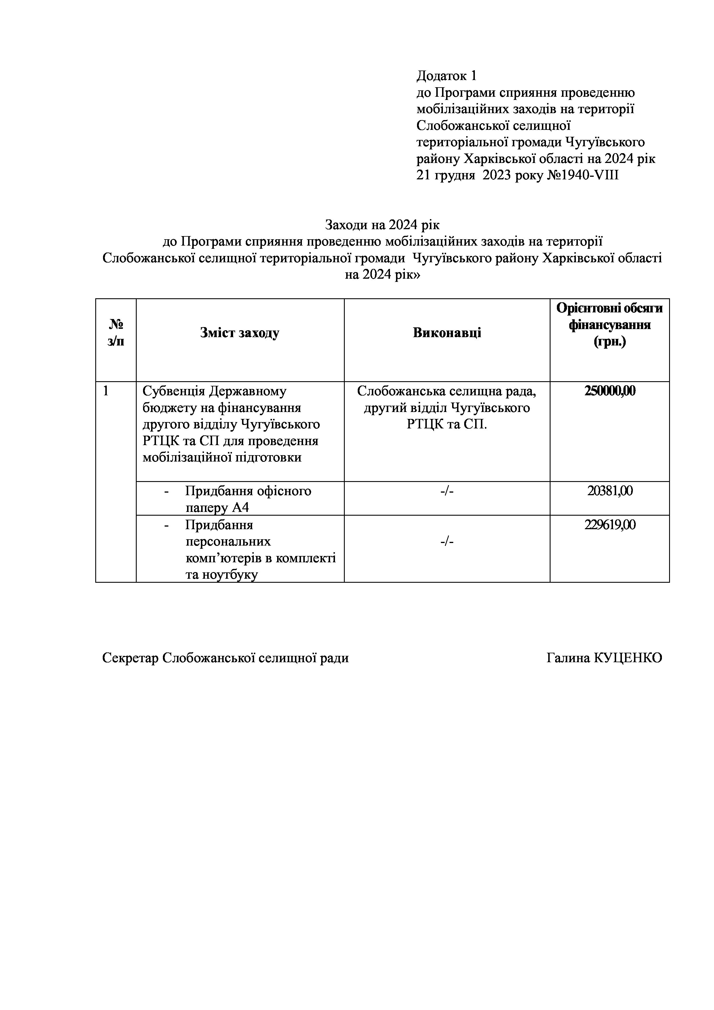 Рішення сесії №2013 Про затвердження заходів на 2024 рік до Програми сприяння проведенню мобілізаційних заходів на території Слобожанської селищної територіальної громади Чугуївського району Харківської області на 2024 рік.
