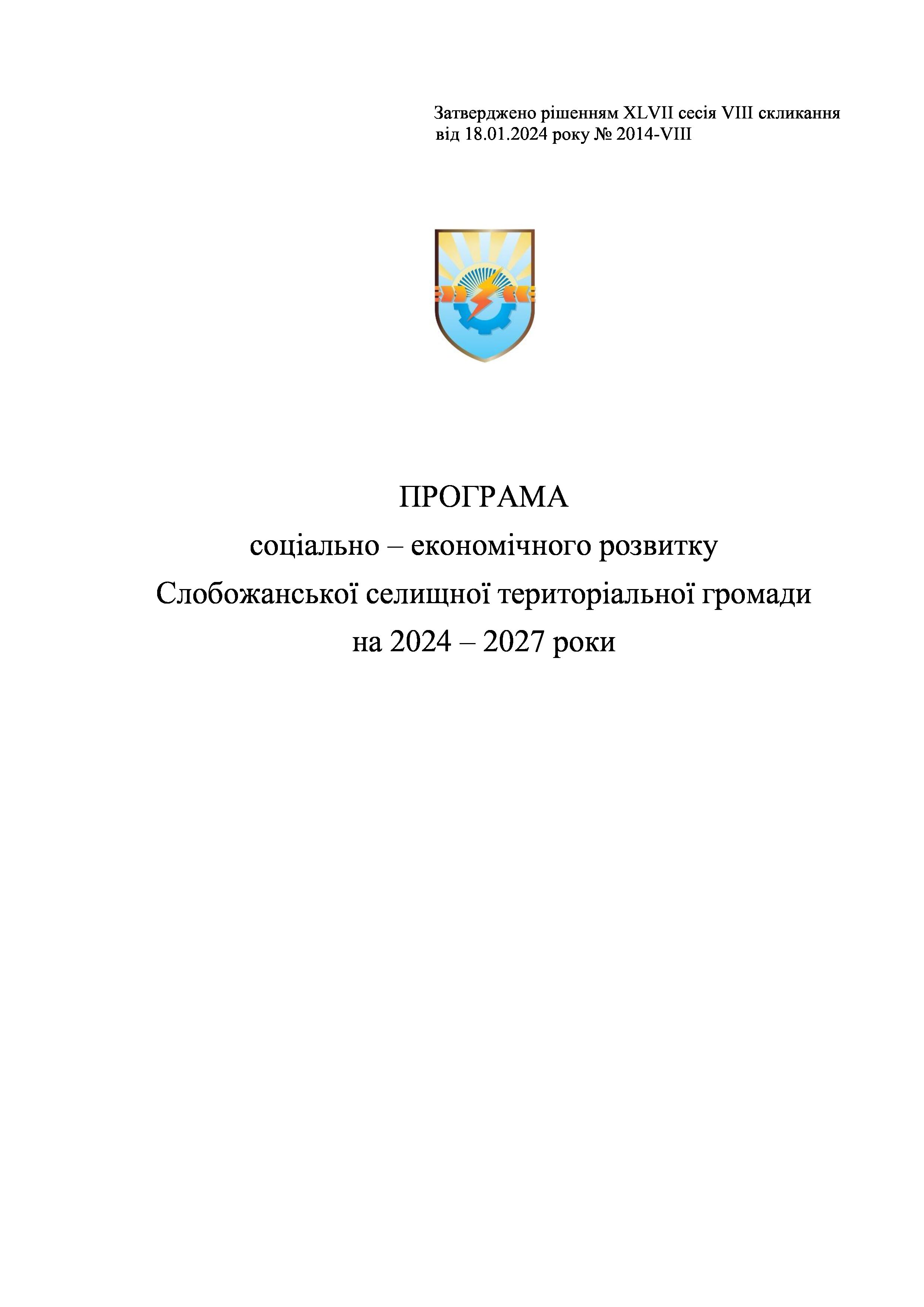 Рішення сесії №2014 Про затвердження Програми соціально-економічного розвитку Слобожанської селищної територіальної громади на 2024-2027 роки.