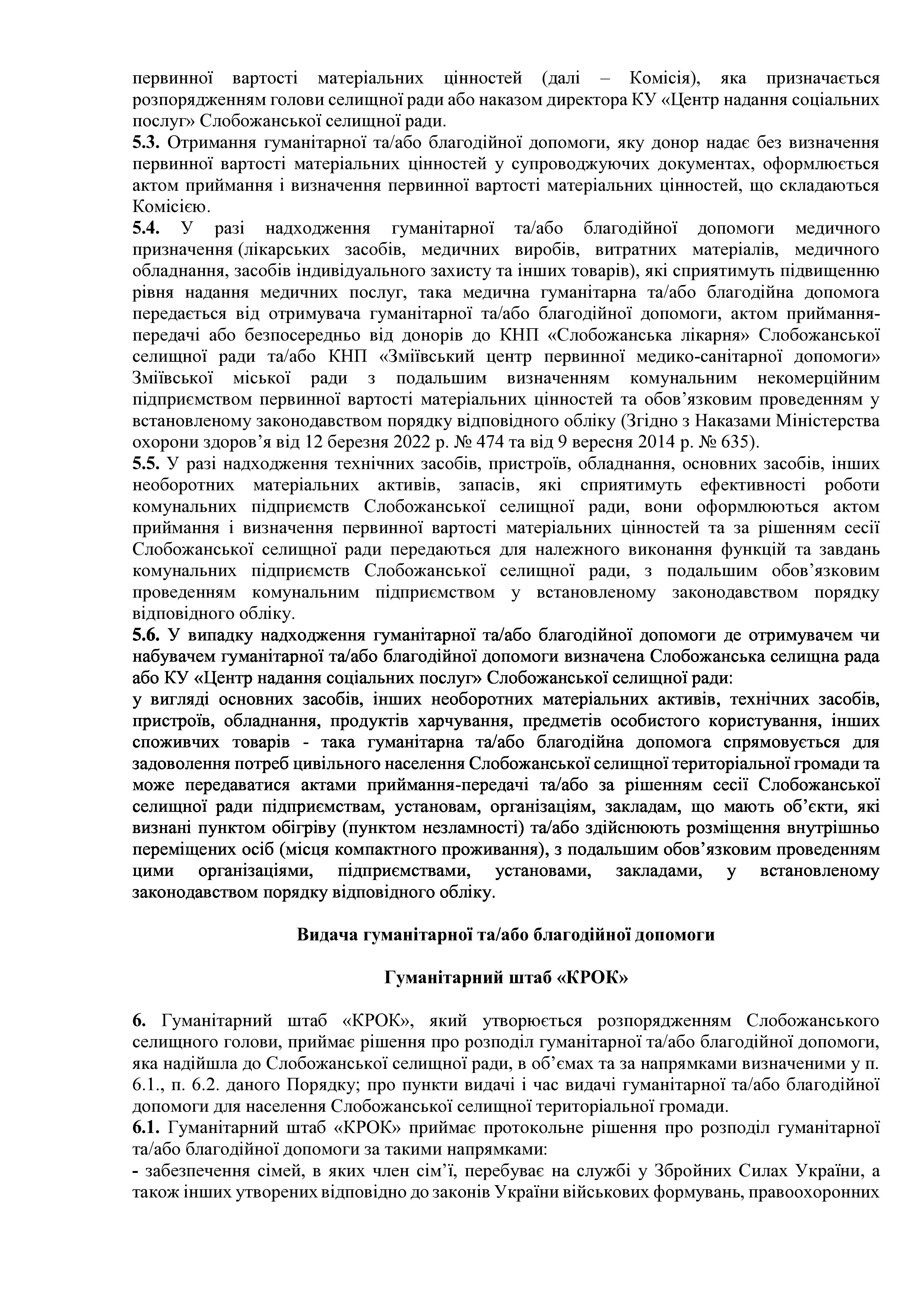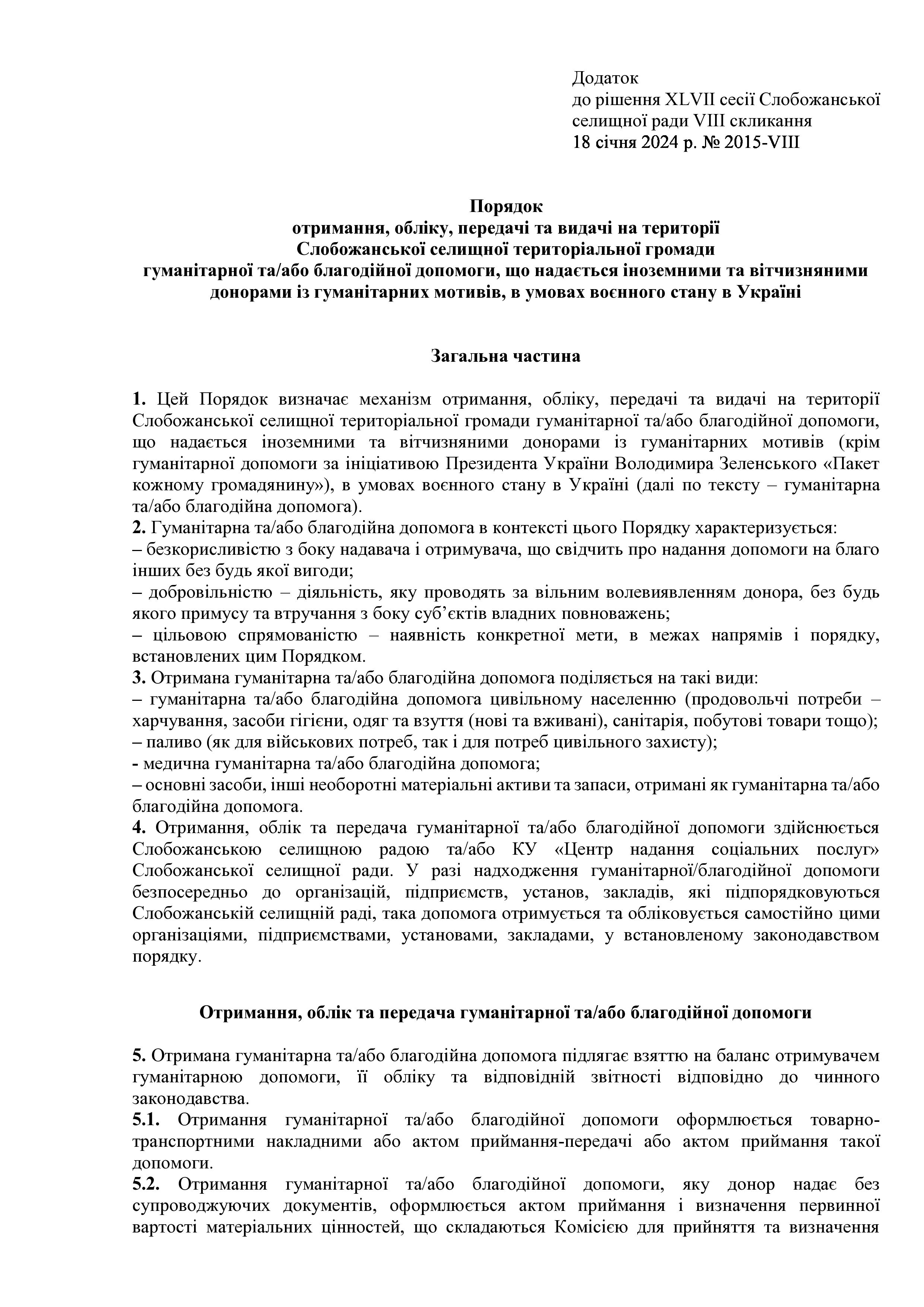 Рішення сесії №2015 Про затвердження Порядку отримання, обліку, передачі та видачі на території Слобожанської селищної територіальної громади гуманітарної та/або благодійної допомоги, що надається іноземними та вітчизняними донорами із гуманітарних мотивів, в умовах воєнного стану в Україні (нова редакція).