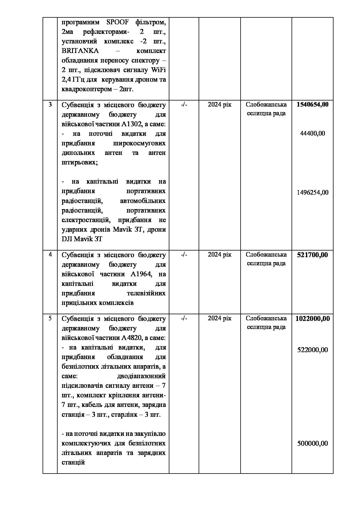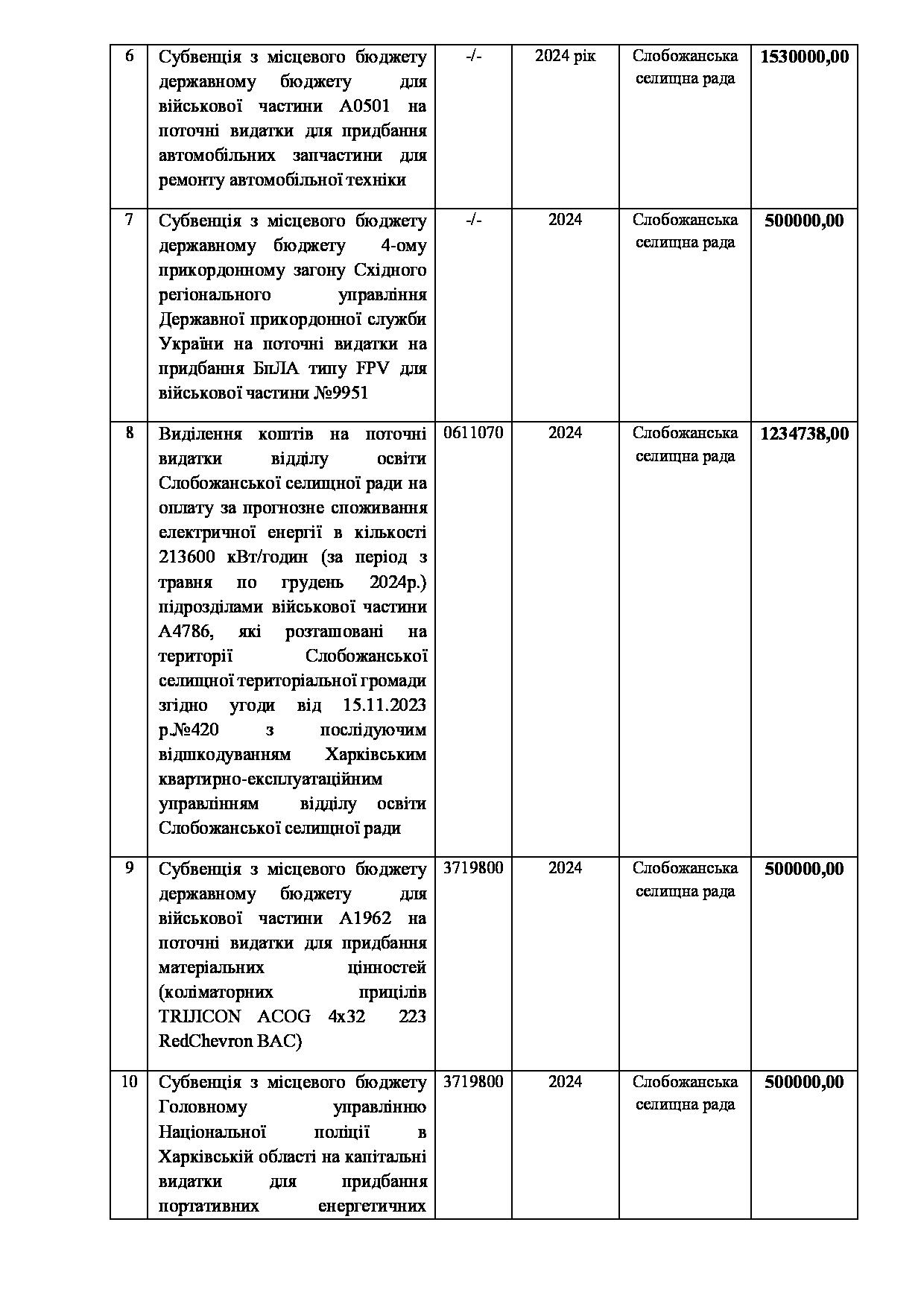 Текст рішення сесії №2324 Про внесення змін до заходів на 2024 рік до Програми підтримки підрозділів Збройних Сил України, Міністерства внутрішніх справ України, територіальної оборони, добровольчих та інших військових формувань Слобожанської селищної ради Чугуївського району Харківської області на 2023-2025 роки.