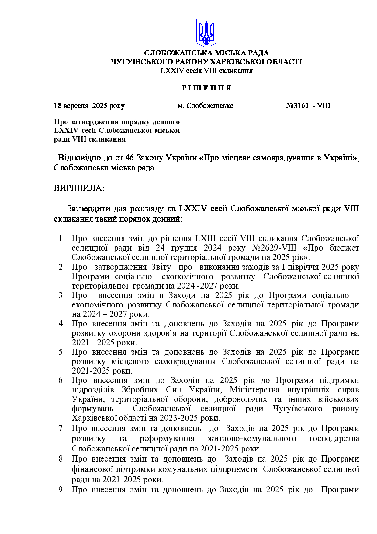 Текст рішення сесії №3161 Про затвердження порядку денного LХХІV сесії Слобожанської міської ради VІIІ скликання