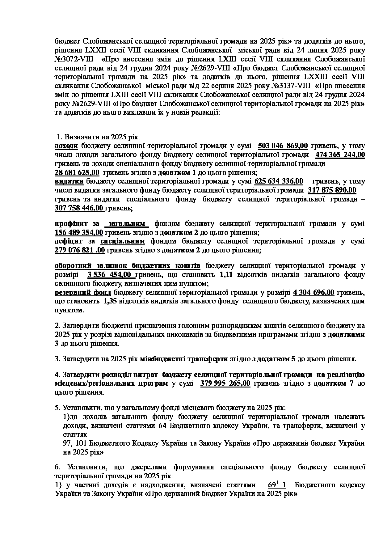 Текст рішення сесії №3162 Про внесення змін до рішення LXIII сесії VIII скликання Слобожанської селищної ради від 24 грудня 2024 року №2629-VIII «Про бюджет Слобожанської селищної територіальної громади на 2025 рік».