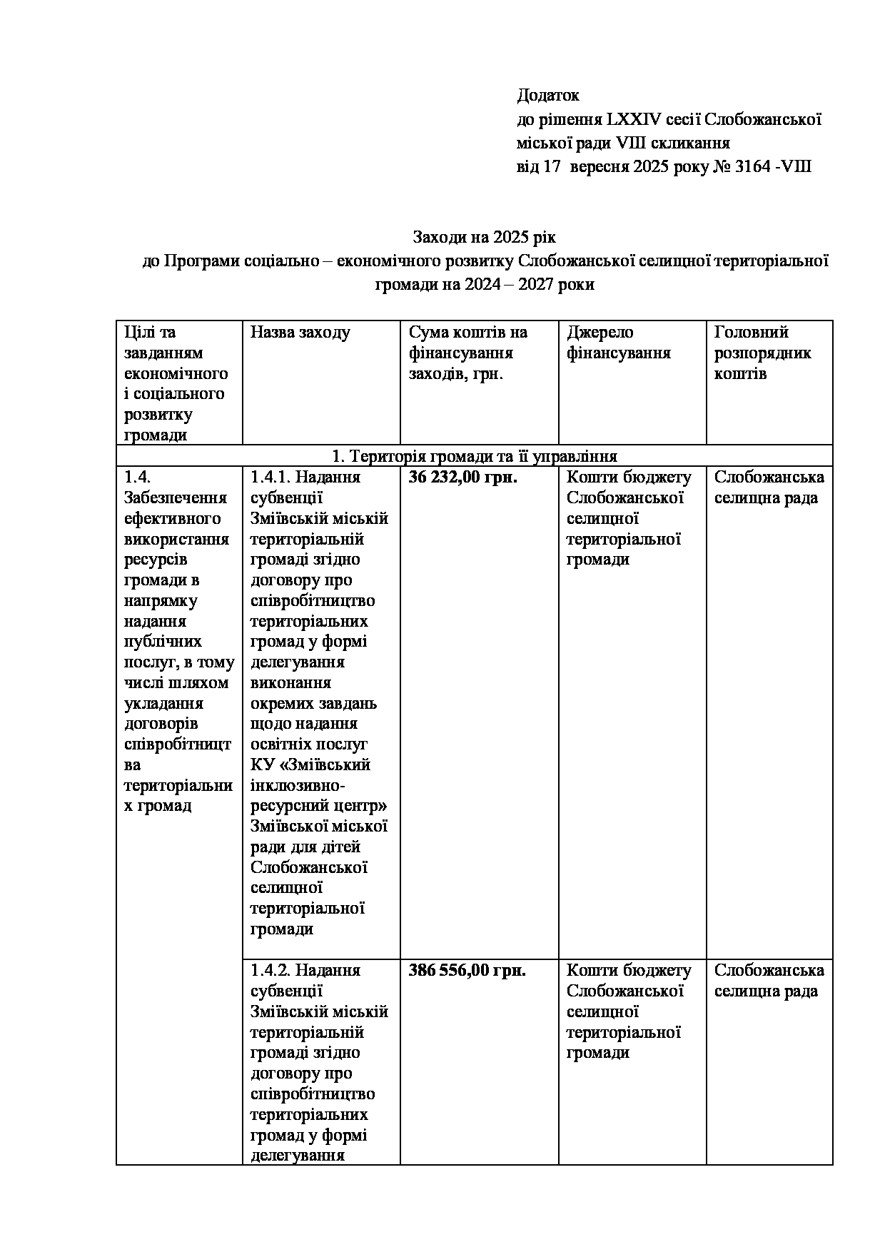 Текст рішення сесії №3164 Про внесення змін в Заходи на 2025 рік до Програми соціально – економічного розвитку Слобожанської селищної територіальної громади на 2024 – 2027 роки.