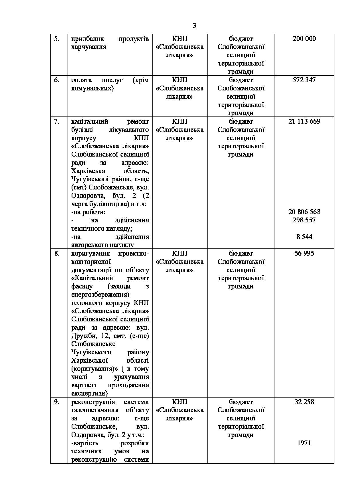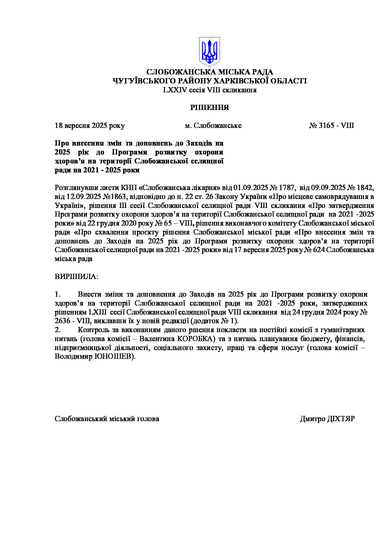 Текст рішення сесії №3165 Про внесення змін та доповнень до Заходів на 2025 рік до Програми розвитку охорони здоров’я на території Слобожанської селищної ради на 2021 - 2025 роки.