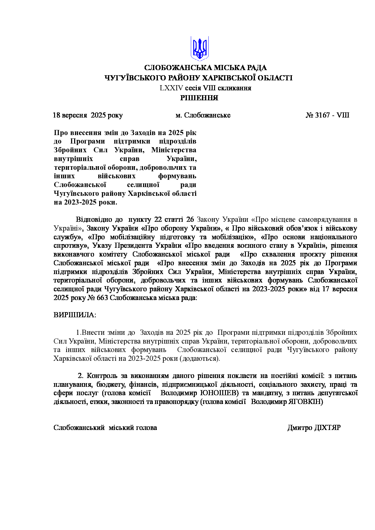 Текст рішення сесії №3167 Про внесення змін до Заходів на 2025 рік до Програми підтримки підрозділів Збройних Сил України, Міністерства внутрішніх справ України, територіальної оборони, добровольчих та інших військових формувань Слобожанської селищної ради Чугуївського району Харківської області на 2023-2025 роки.