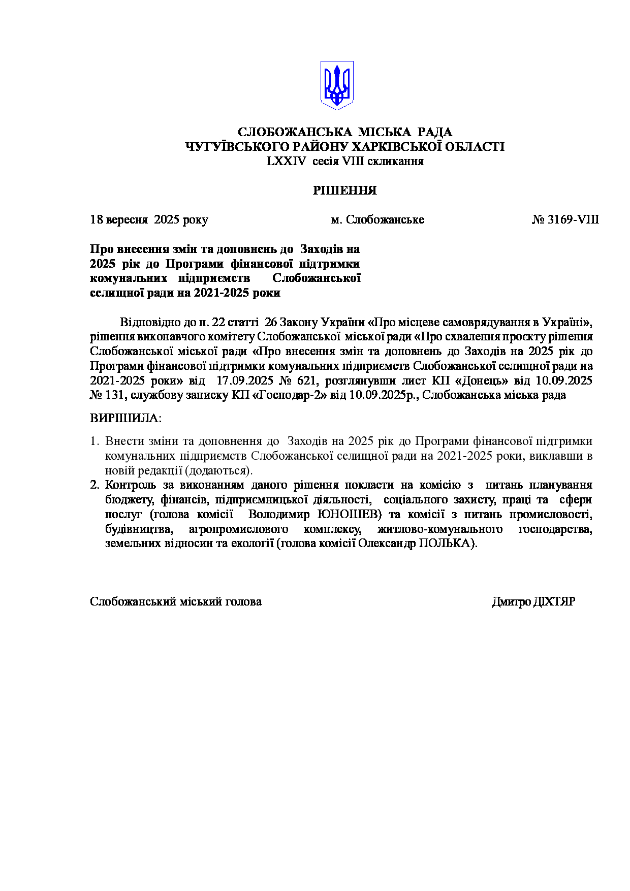Текст рішення сесії №3169 Про внесення змін та доповнень до Заходів на 2025 рік до Програми фінансової підтримки комунальних підприємств Слобожанської селищної ради на 2021-2025 роки.