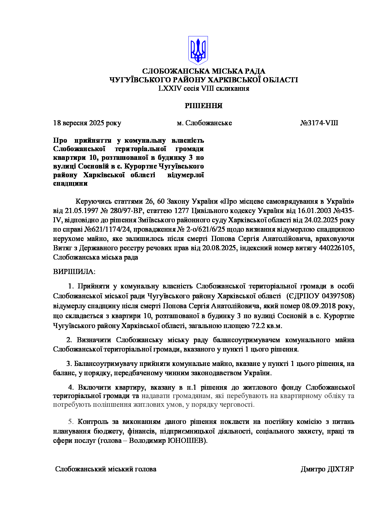 Текст рішення сесії №3174 Про прийняття у комунальну власність Слобожанської територіальної громади квартири 10, розташованої в будинку 3 по вулиці Сосновій в с. Курортне Чугуївського району Харківської області відумерлої спадщини.