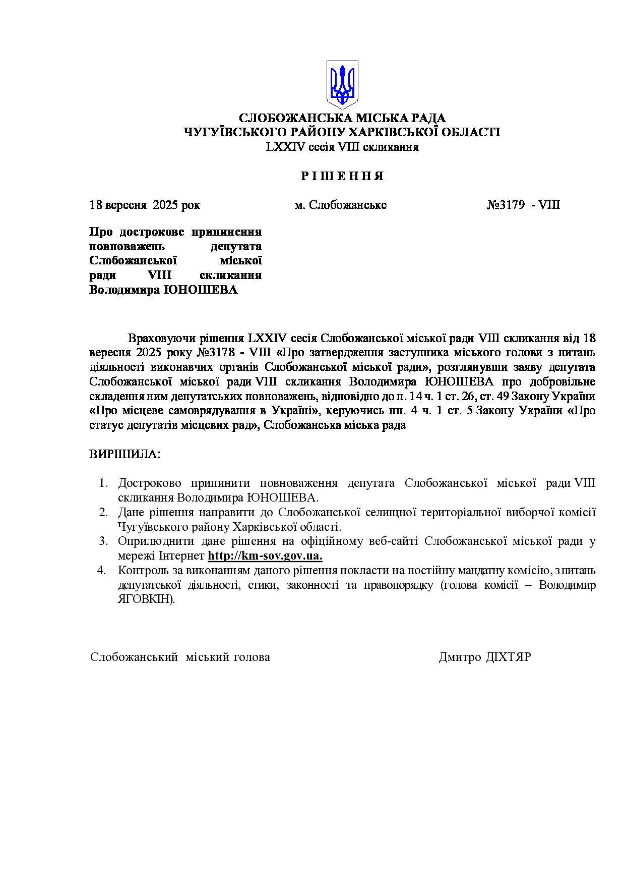 Текст рішення сесії №3179 Про дострокове припинення повноважень депутата Слобожанської міської ради VІІІ скликання Володимира ЮНОШЕВА.
