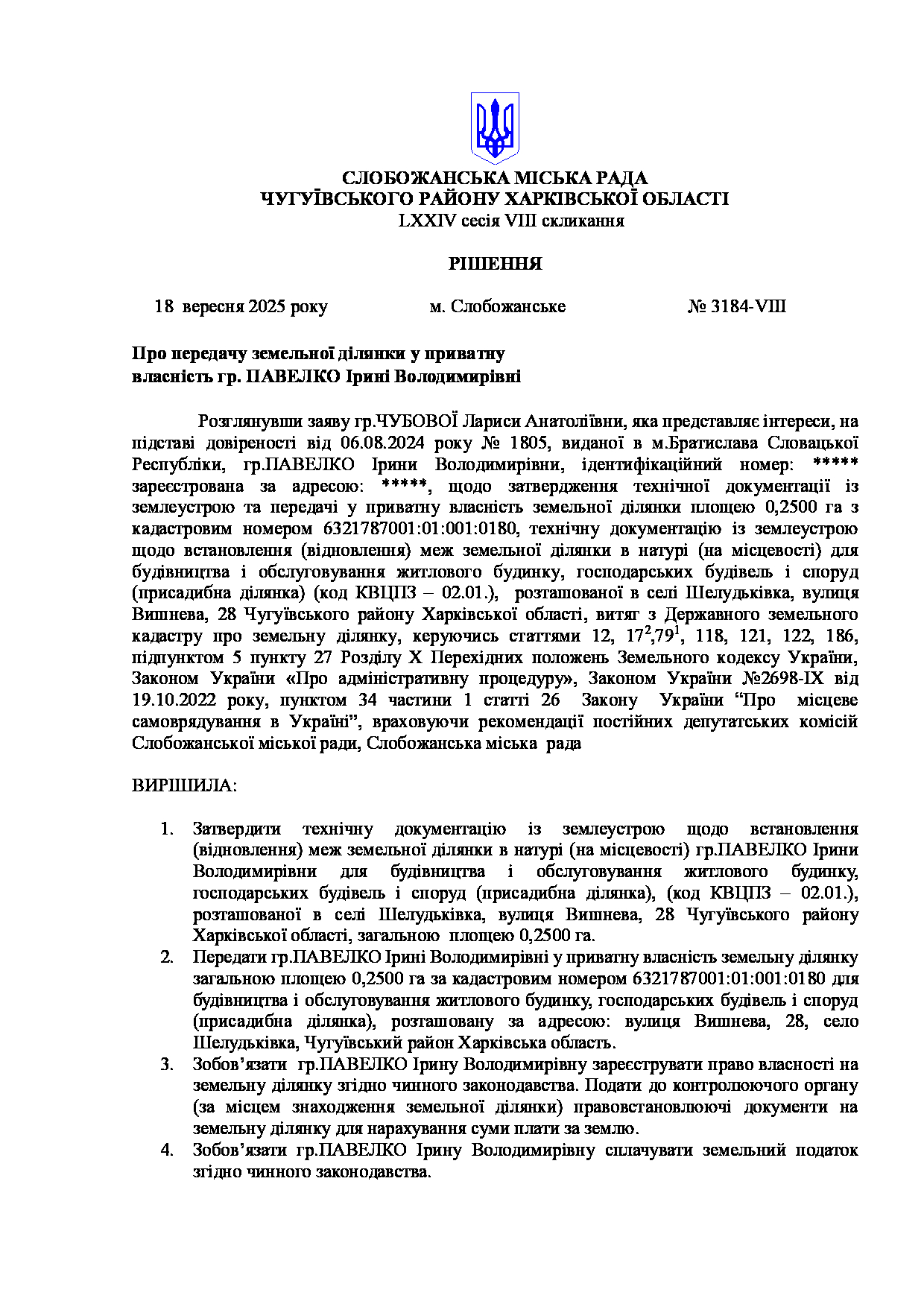 Текст рішення сесії №3184 Про передачу земельної ділянки у приватну власність гр. ПАВЕЛКО Ірині Володимирівні.