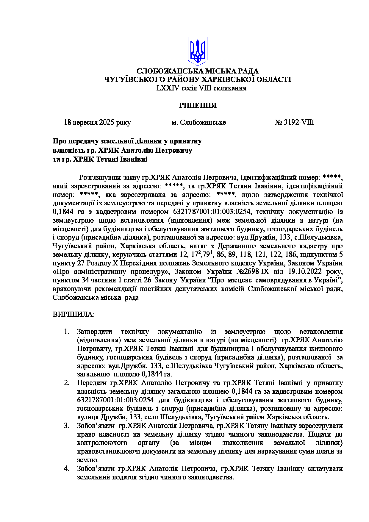 Текст рішення сесії №3192 Про передачу земельної ділянки у приватну власність гр. ХРЯК Анатолію Петровичу та гр. ХРЯК Тетяні Іванівні.