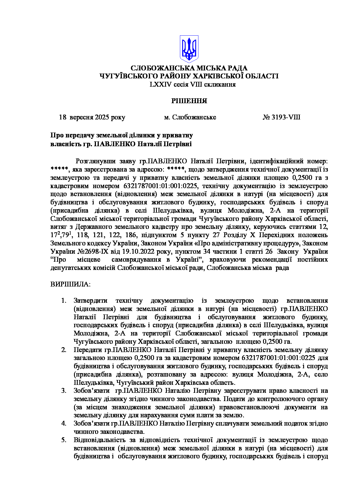 Текст рішення сесії №3193 Про передачу земельної ділянки у приватну власність гр. ПАВЛЕНКО Наталії Петрівні.