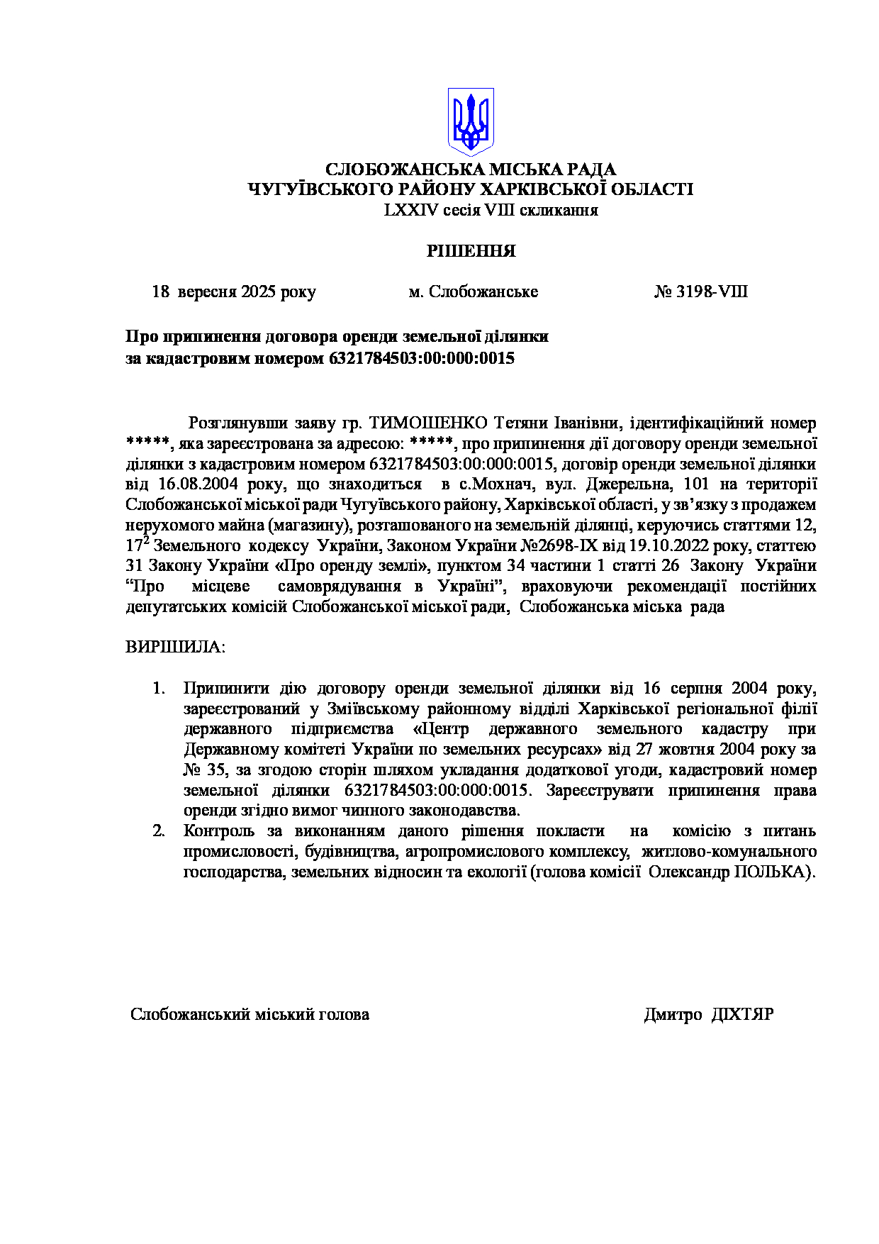 Текст рішення сесії №3198 Про припинення договора оренди земельної ділянки за кадастровим номером 6321784503:00:000:0015.