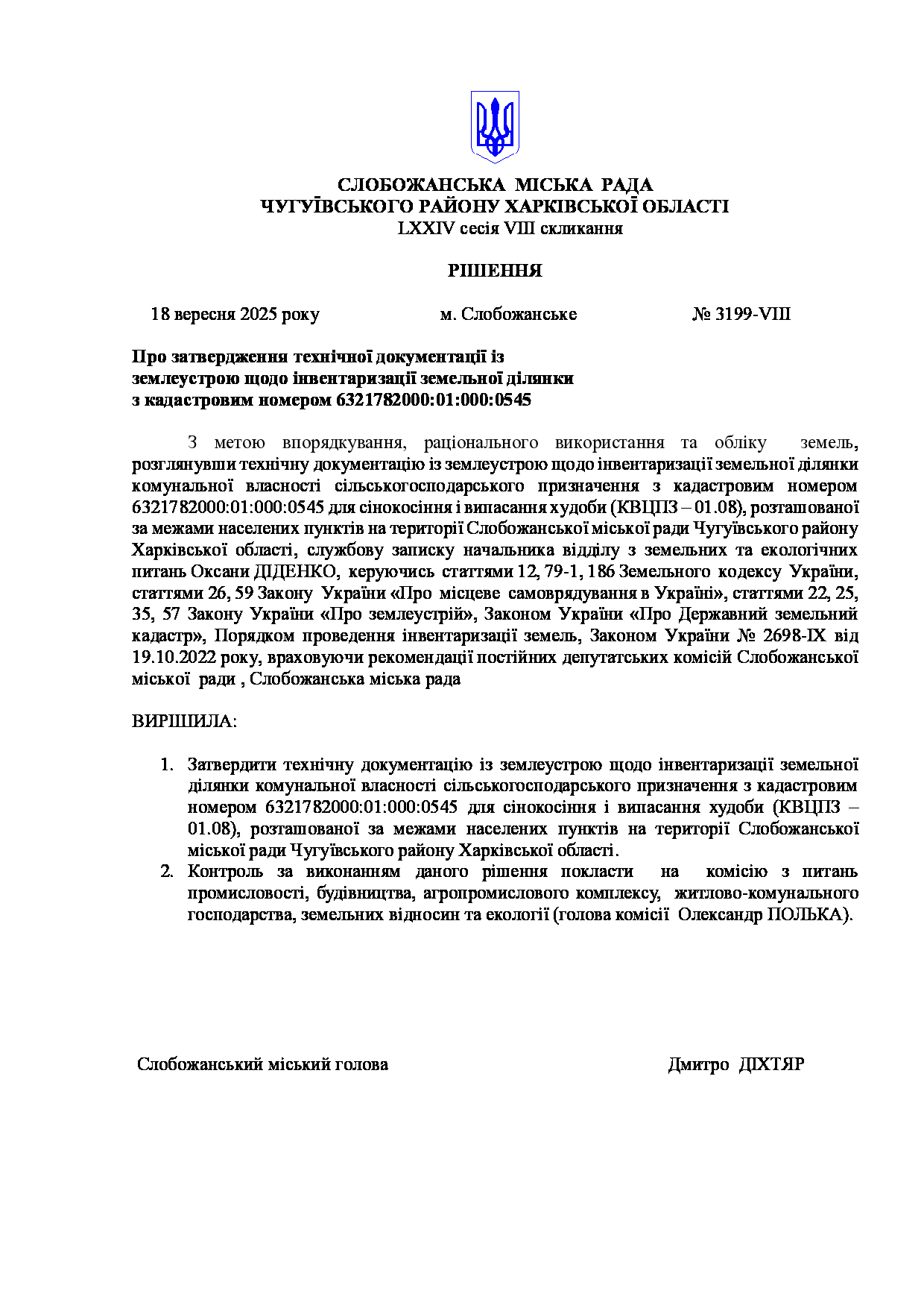 Текст рішення сесії №3199 Про затвердження технічної документації із землеустрою щодо інвентаризації земельної ділянки з кадастровим номером 6321782000:01:000:0545.