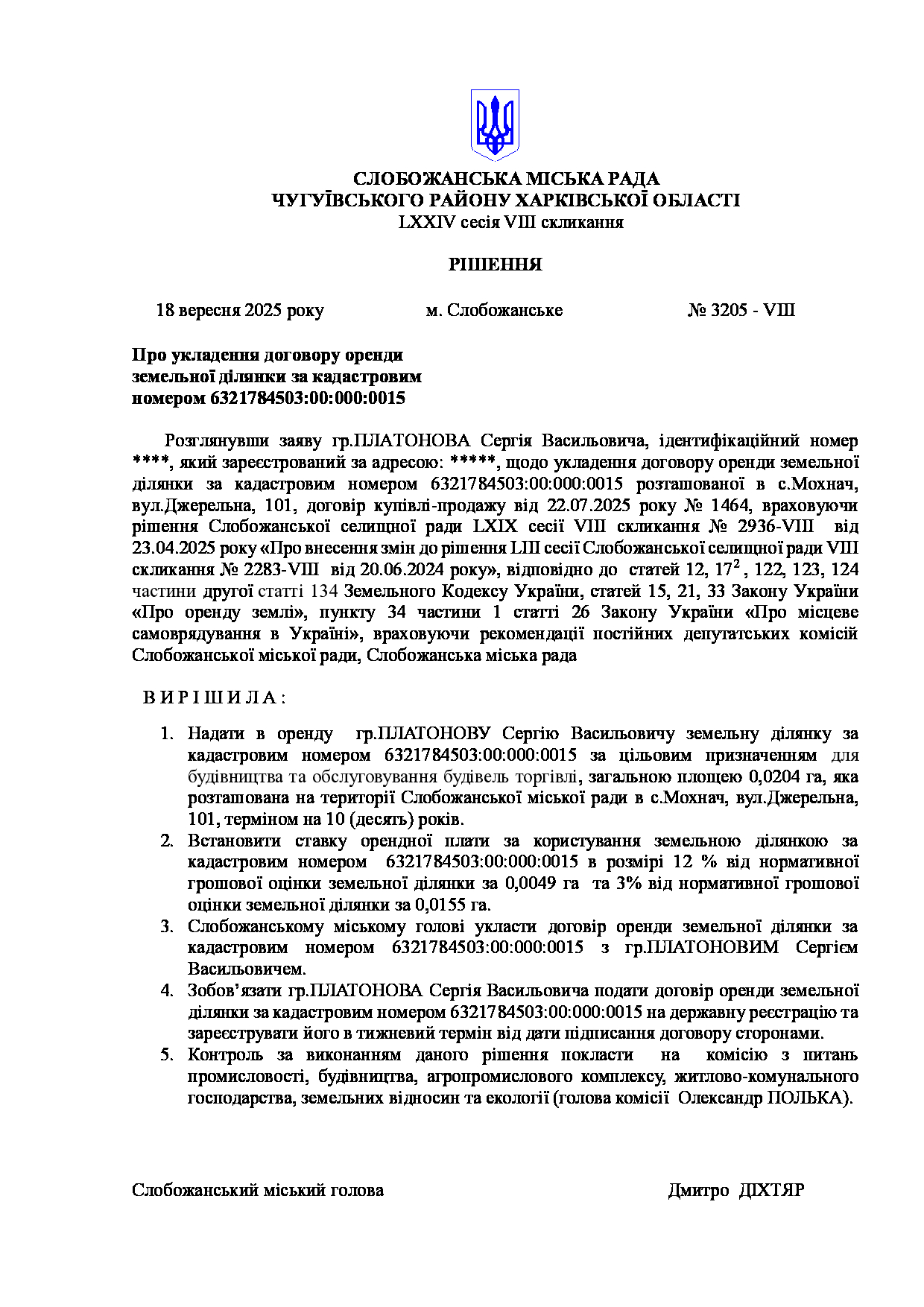 Текст рішення сесії №3205 Про укладення договору оренди земельної ділянки за кадастровим номером 6321784503:00:000:0015.